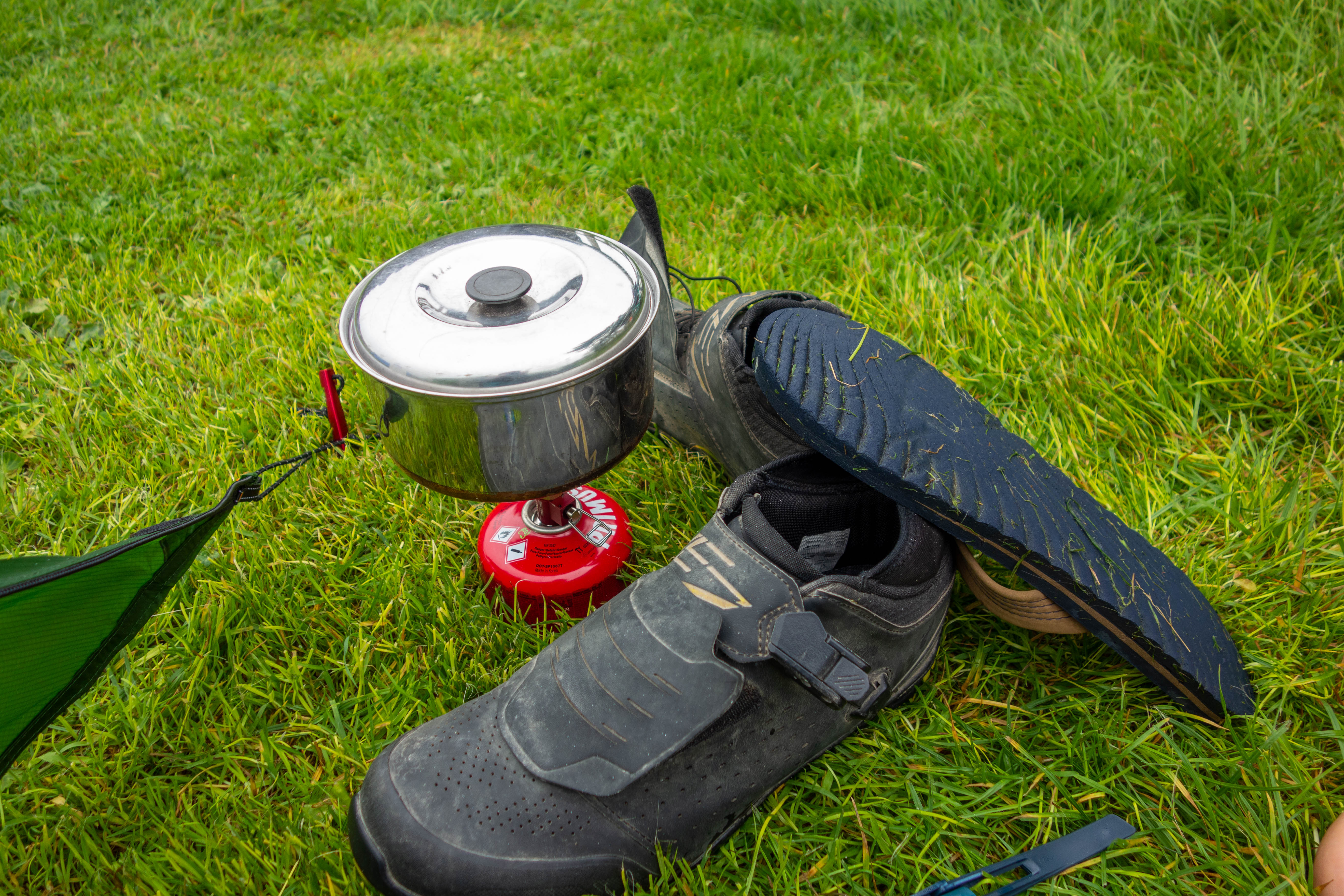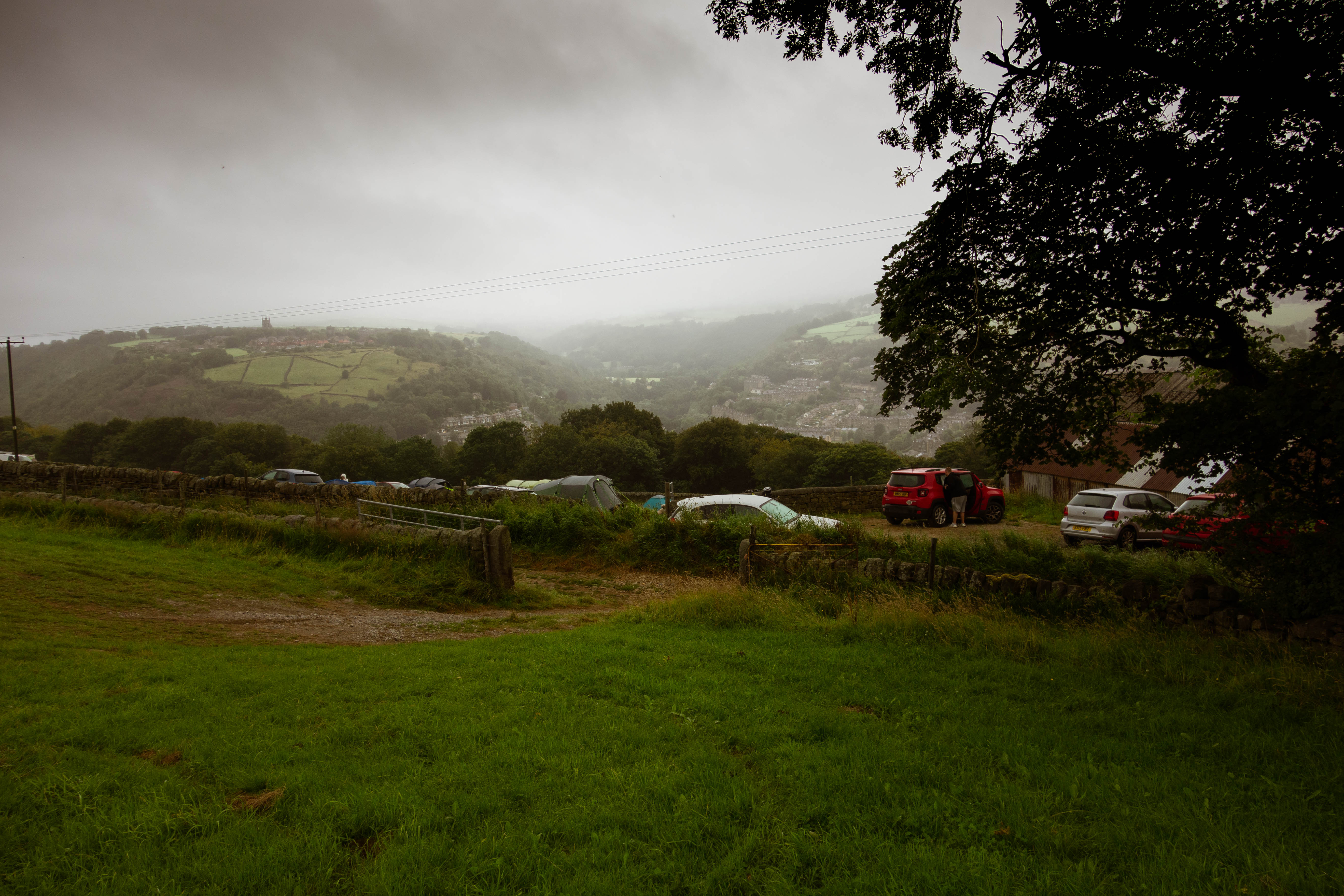 I was feeling tired by this point and cross at the extra climb, rather than appreciating the scenery. I crossed the canal again and headed up onto the moor. In the grey dusk light the moorland seemed bleak and the limestone pavement made for an uncomfortable ride with no suspension. I was glad to descend off the moor and back onto some tarmac. I rode past a few pubs, toying with the idea of stopping to eat, but decided to keep going in the hope of finding the campsite before it got too dark. The tarmac road turned into a byway that mercifully skirted round the hills this time. I had no energy left by this point but I pressed on, hoping the campsite would appear soon. Finally, after a rough farm track that was more pothole than track, it did. To my surprise, the three lads I had met earlier arrived at the same time from the other direction.