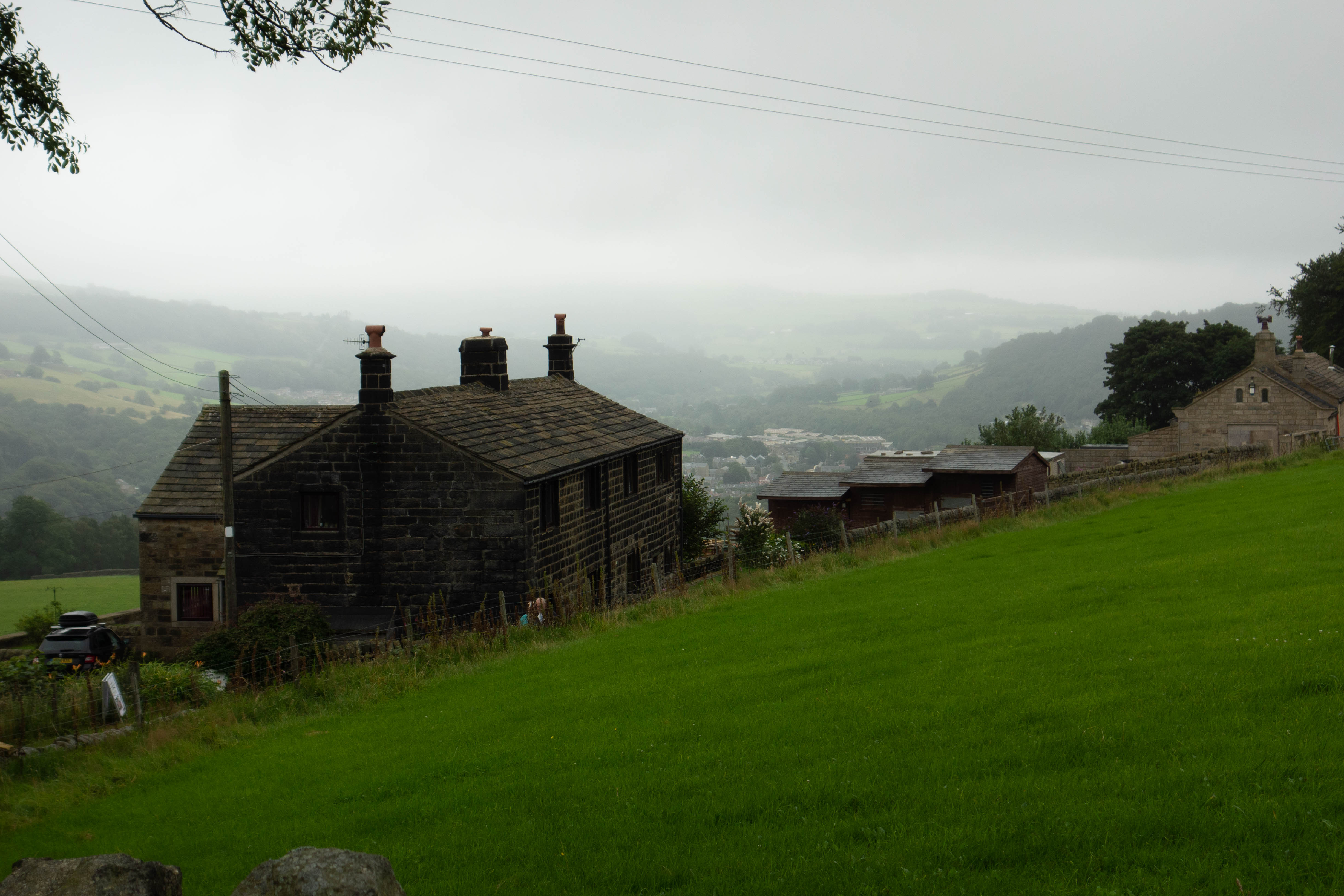 It was a damp start to the day and a mist was hanging over the valley. After a breakfast roll at the campsite I rode the wet descent down into the town of Hebden Bridge to find a shop and get some snacks for the day’s ride. The climb out of Hebden Bridge was really steep. I chose to follow the road for a short while until I picked up the GNT route again, mostly because I thought this would be an easier start. Little did I know that the 3.3km, (225m) route I had chosen up Mytholm Steeps features in “Another 100 Greatest Cycling Climbs” and has a max gradient of 25%, which, with all my kit on the bike, reduced me to walking. I joined the trail and climbed up onto the moors, passing several more reservoirs before a lovely long descent led me to a wonderful series of switchbacks and a horrendously wet and rutted track. The track took me down into a small hamlet where there was a window to buy coffee and cake from.