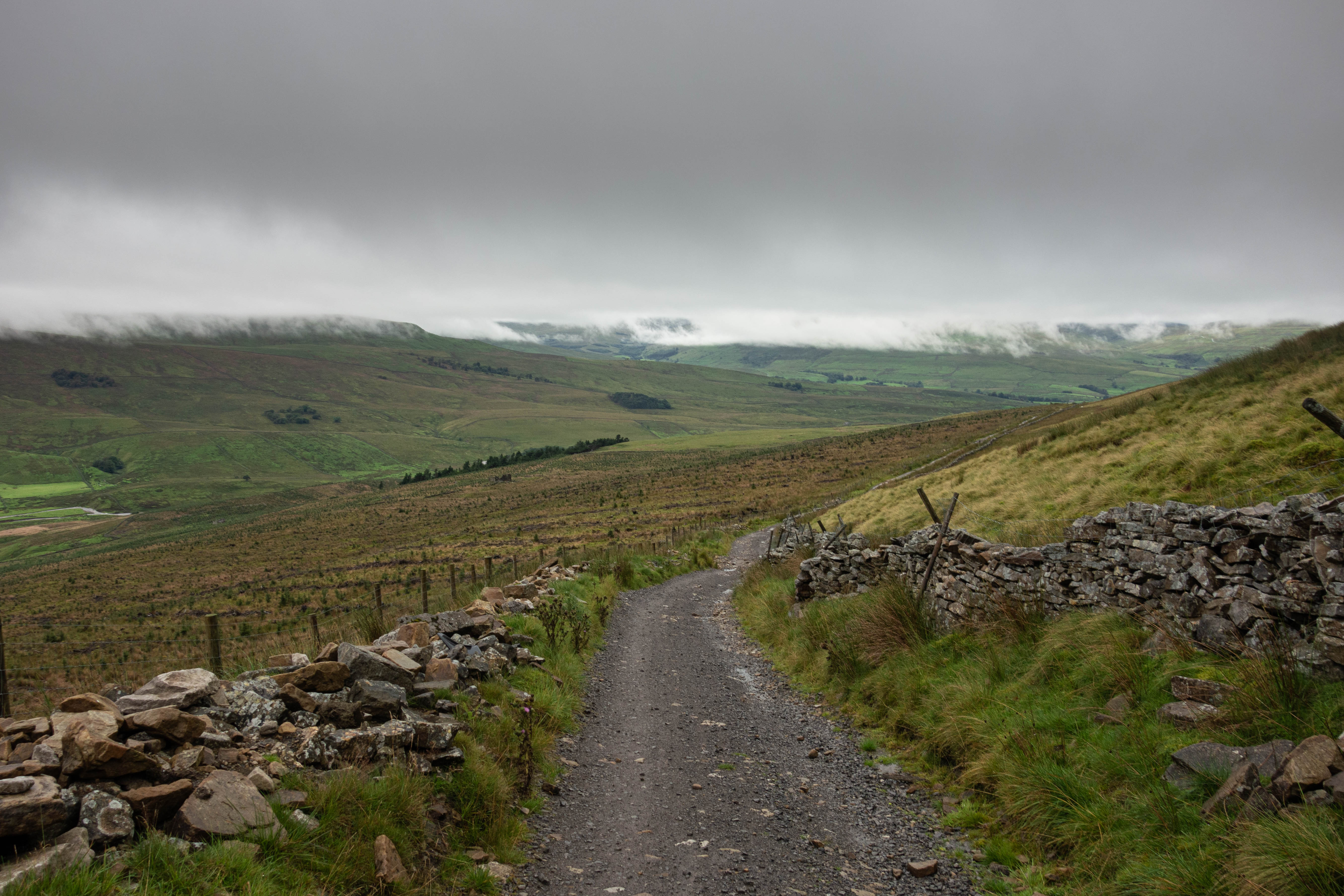 Day three started with a steady climb up Dodd Fell. The climb was, for the most part, a decent gravel road, maintained for access to nearby forest. As I climbed into the cloud it got very wet and visibility reduced. To my surprise the track turned into tarmac for a while before turning back into rutted and washed out gravel. I descended along the edge of the Fell and down into Hawes where I got a good breakfast at The Wensleydale Pantry before heading off again.