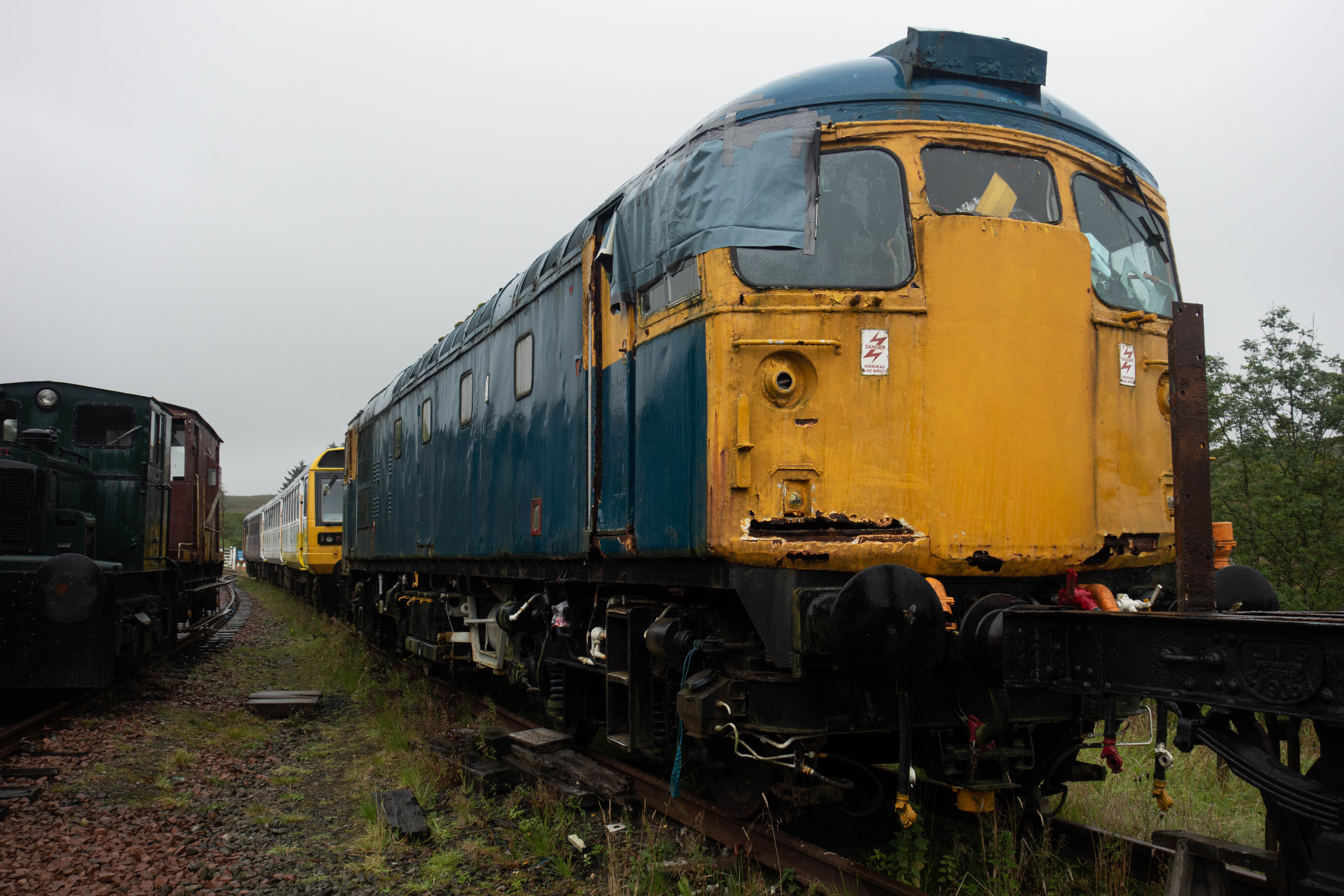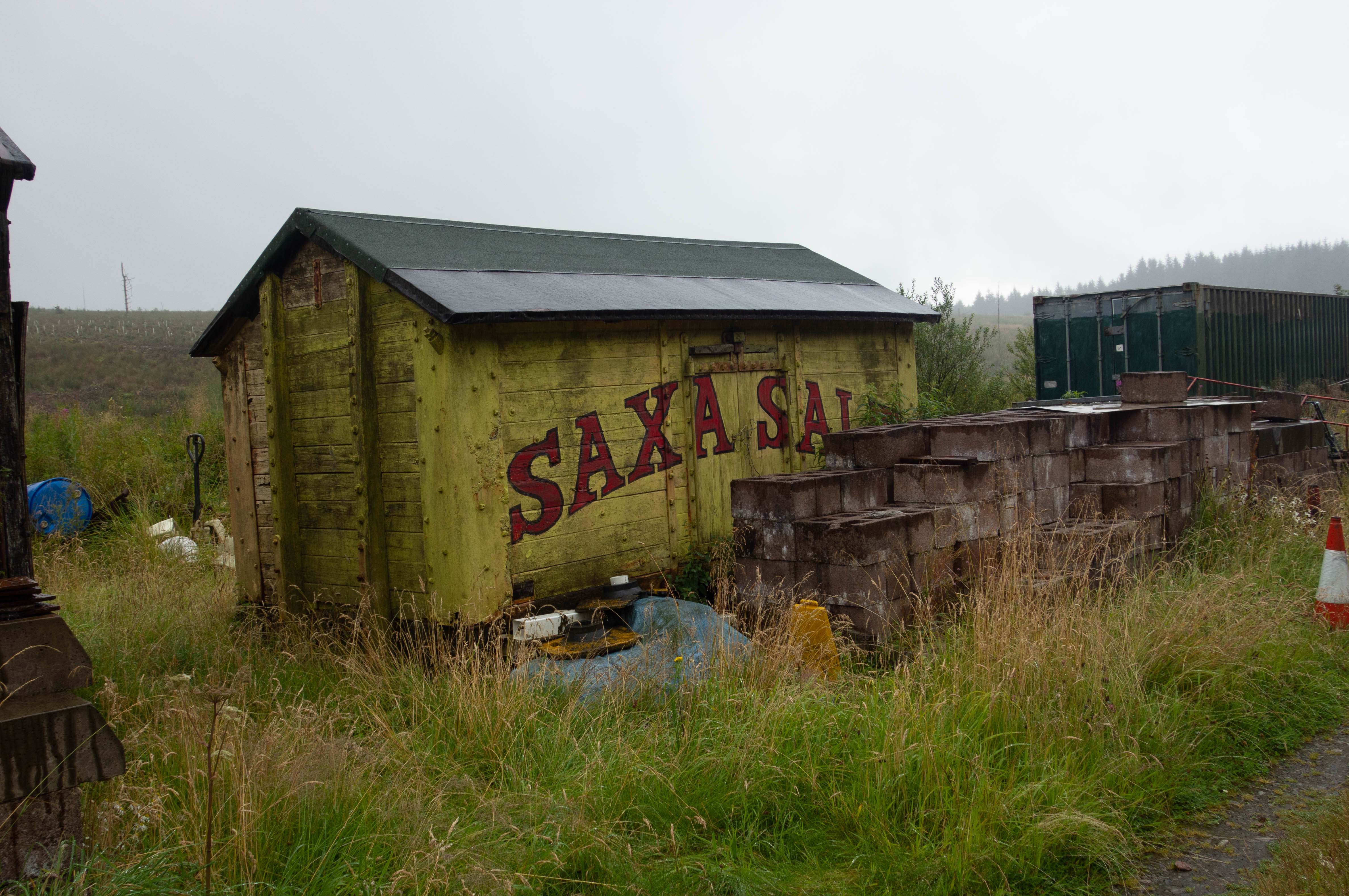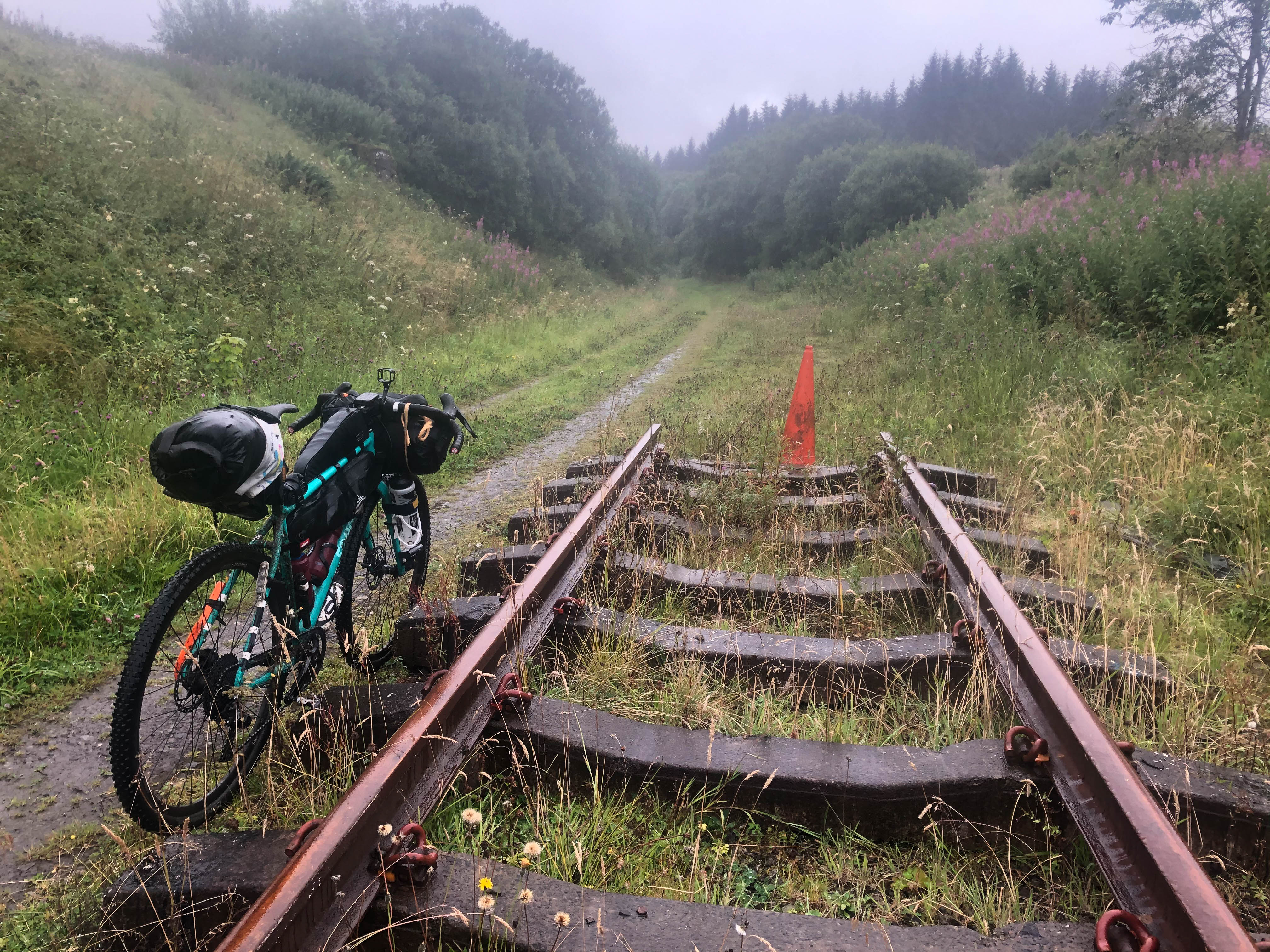 I forgot to turn off and resupply in Kielder village and carried on along the cross border trail along forest roads and up onto the moor where the trail became singletrack. It started to rain as I crossed the border into Scotland, marked by gate posts and a big rock pillar. A fast, wet, descent took me down off the moor and onto quiet roads before joining the old railway line. It rained pretty heavily from this point onwards. I passed the old station at Riccarton Junction and the abandoned village it once served and onto the train museum at Whitrope Tunnel Sidings. I stopped to look at the old trains before heading up the short climb and slippery descent over the hill that the tunnel once passed through. The trail continued to follow the old railway line, although the path was less defined than it had been before. I rode through small farmyards, past a quirky house converted from an old signal box, detoured round an old viaduct and negotiated a herd of cows that were grazing where the line had once run, before rejoining the road for a very wet ride into Hawick.