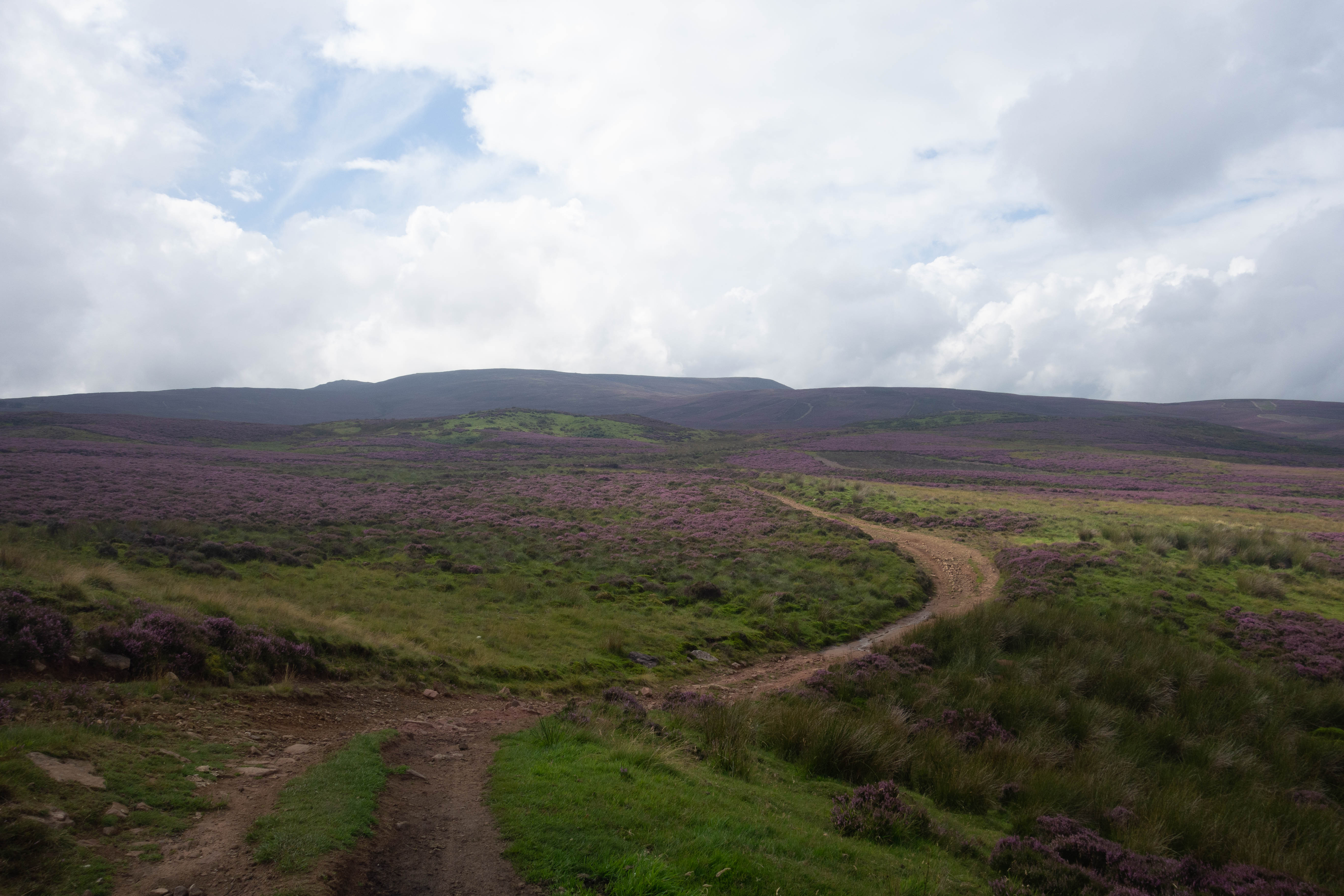 After a quick trip to the petrol station and supermarket for some supplies and a visit to the ironmonger, bike shop and camping store to get another can of gas, I headed off up the steep track through the woods and onto some rough old military roads. I then joined a fast forest track that descended down into a valley, crossing the road and climbing a long steep logging track up onto the moorlands and into the clouds.