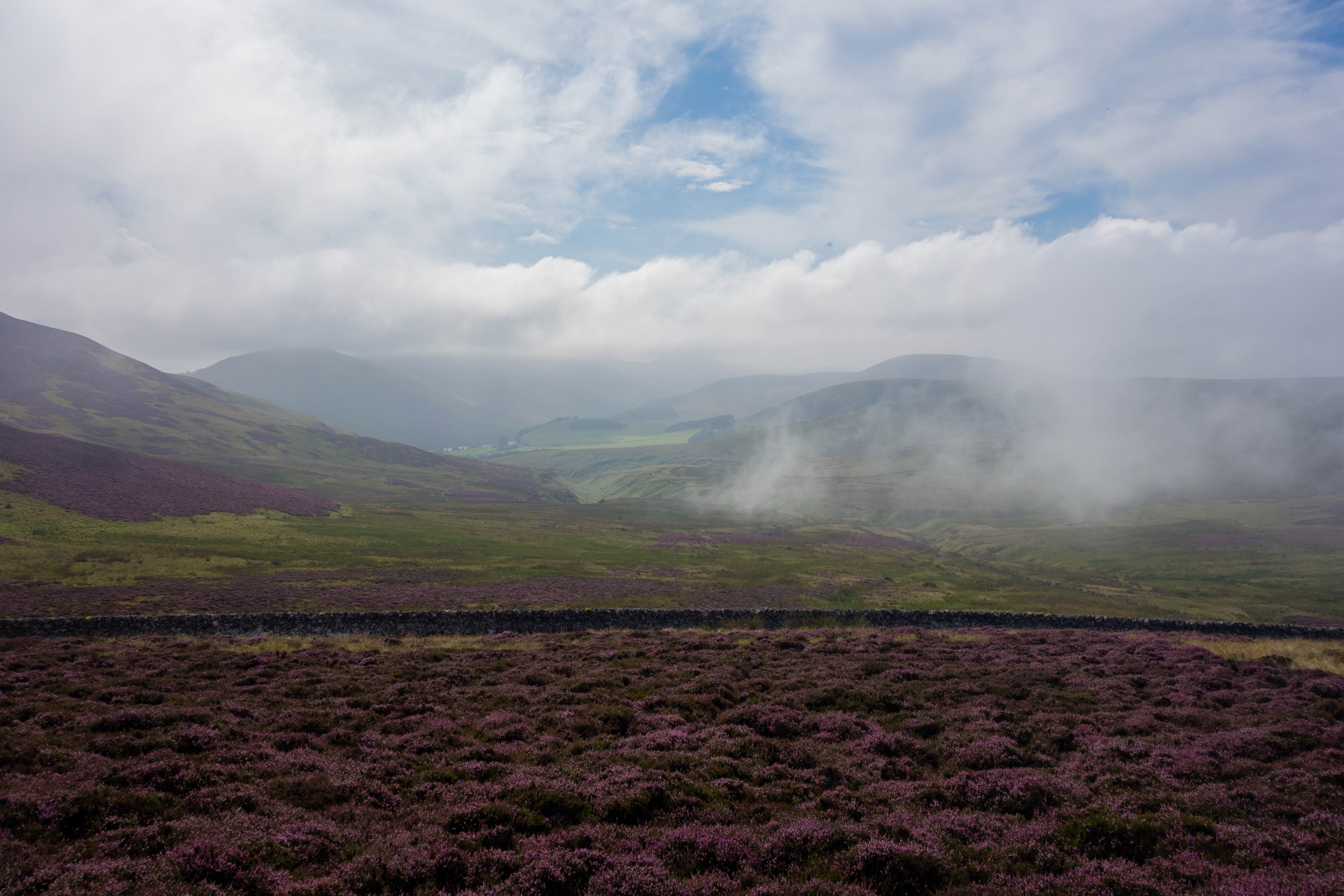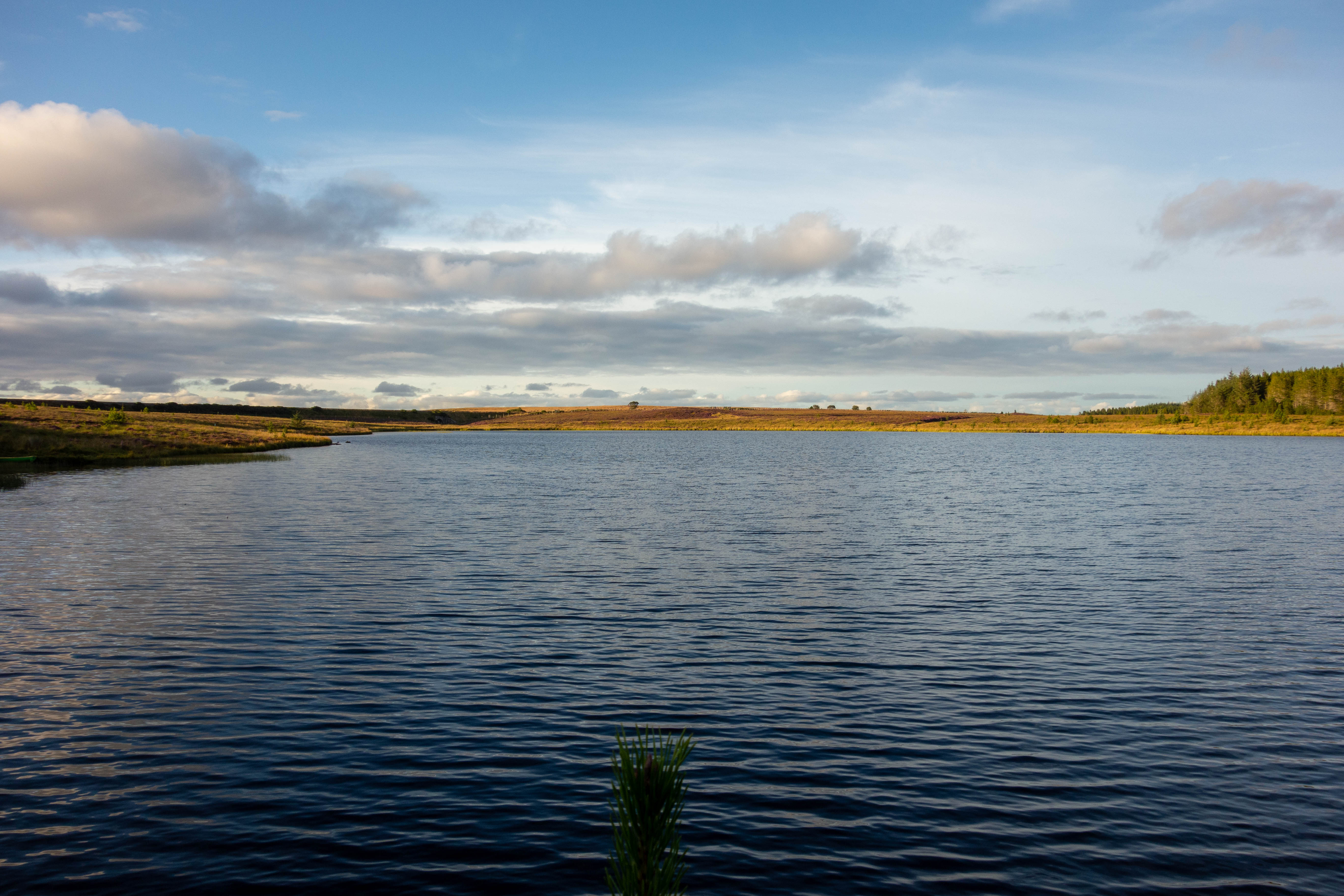 I Packed up and rode into Peebles where I bought some new drybags to replace the ones that had holes in them and a full Scottish breakfast at Wetherspoons. The route carried on along the road to West Linton, where I stopped for a quick coffee at a little café beside the road. The trail then left the tarmac and followed an old drove for a while before heading up past an idyllic looking reservoir and onto the moor again. The trail up was steep, boggy in places and not the easiest surface to ride, but once at the top the ride down was good and the moorland was empty with nothing but patches of heather.