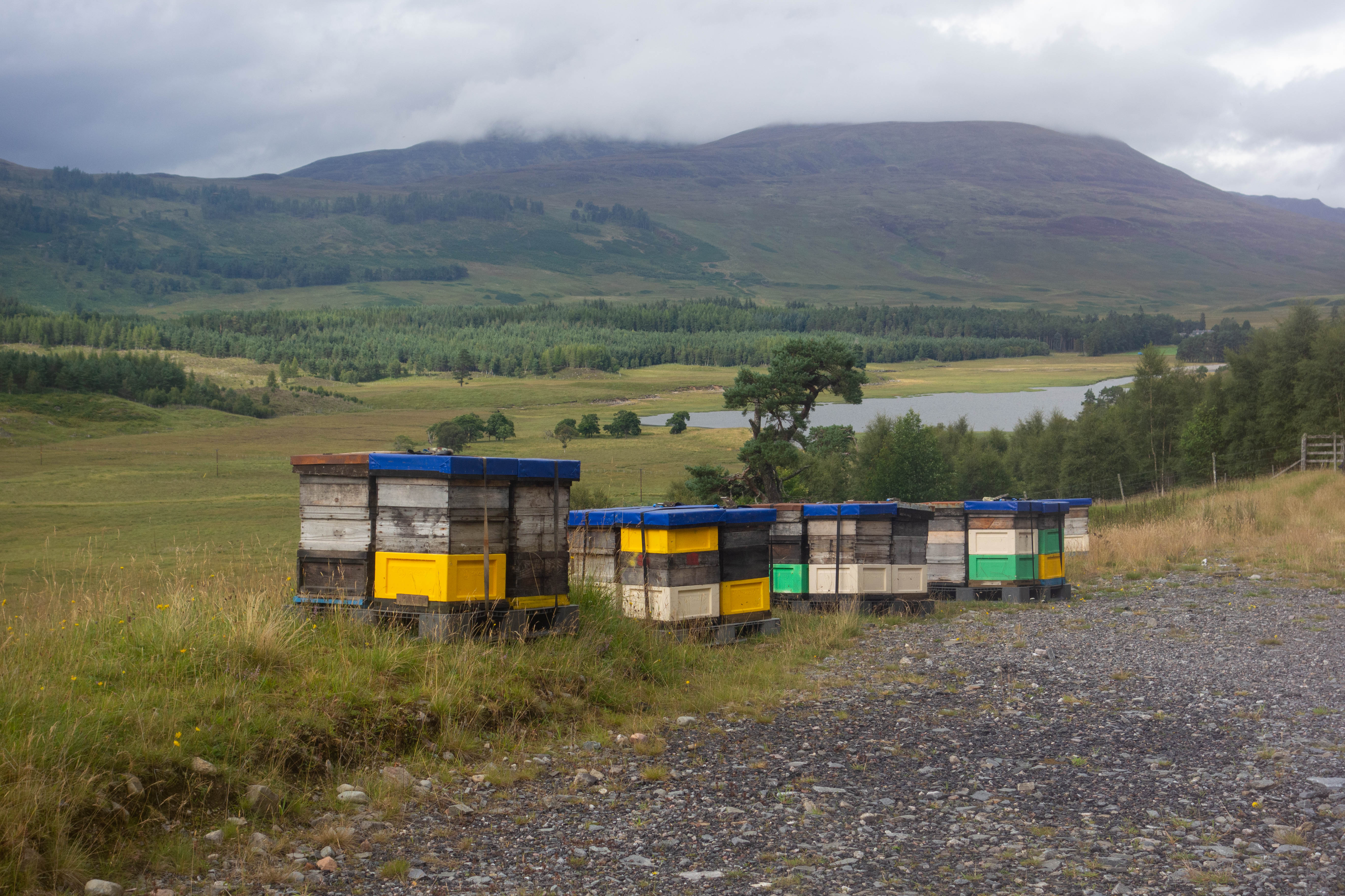The military road and the dry weather continued as I rode along the ridge with great views in every direction. As the trail dropped down into the valley I stopped to take a photo of some beehives. One of the bees got stuck in my helmet and stung me. I pulled the sting out, took the photo and crossed through a gate into a deer sanctuary. As I descended down to the road I wondered if I was allergic to bee stings, and if I was, what I could do about it with no one around and no phone signal. There was a house and some estate buildings by the road, but my face still felt a normal size so I decided that it was probably ok to carry on. I turned left and followed the tarmac road along the glen to Melgarve.