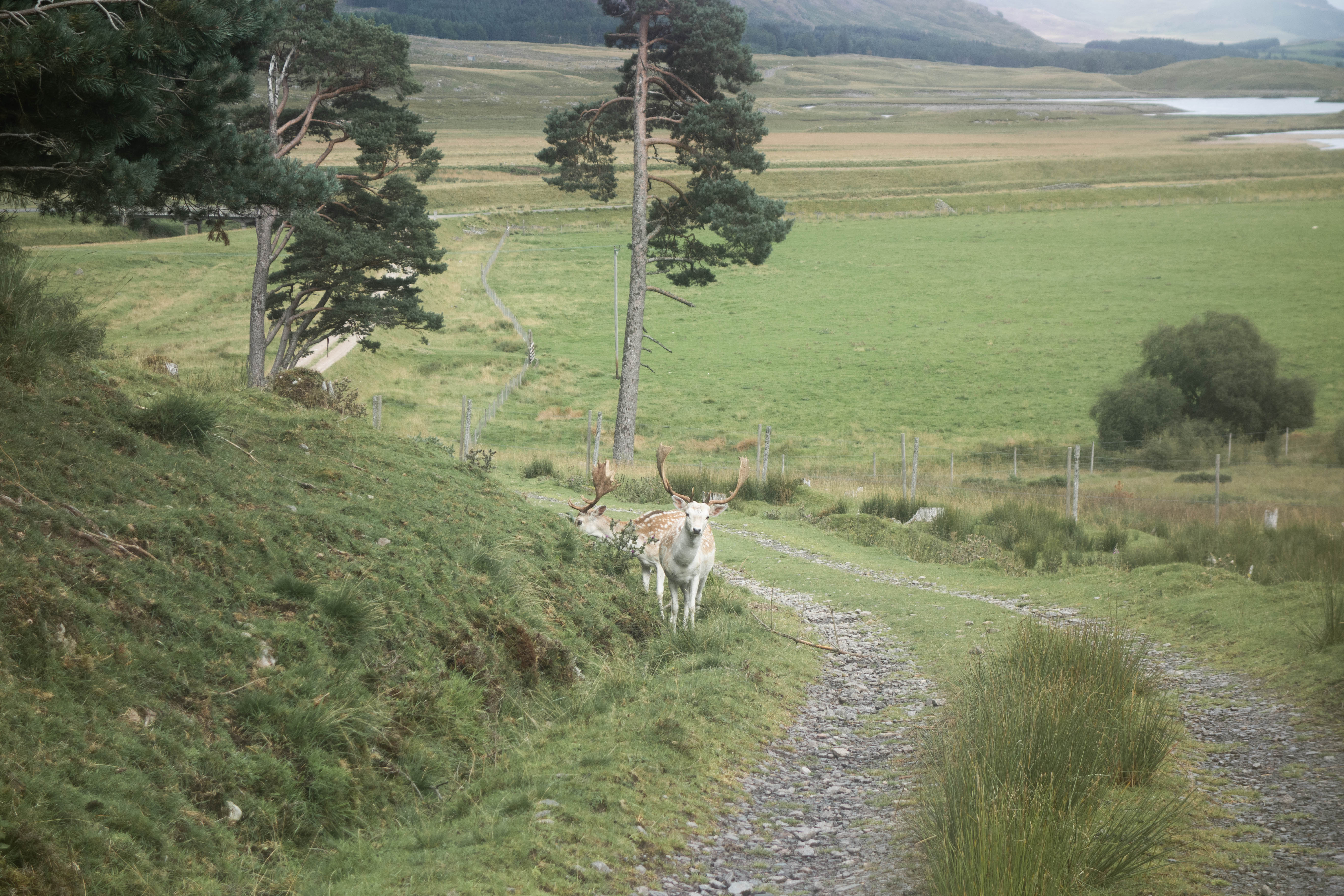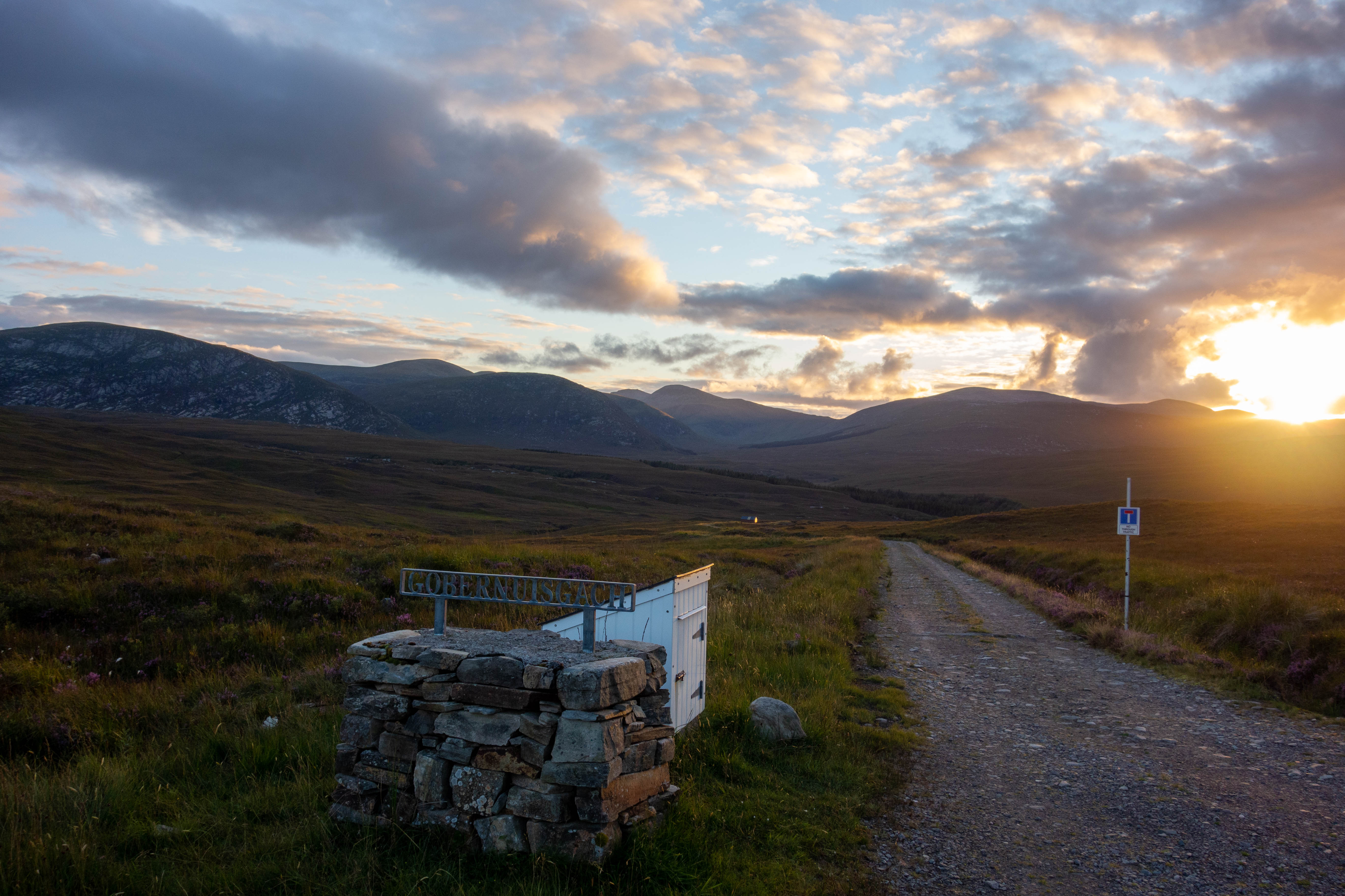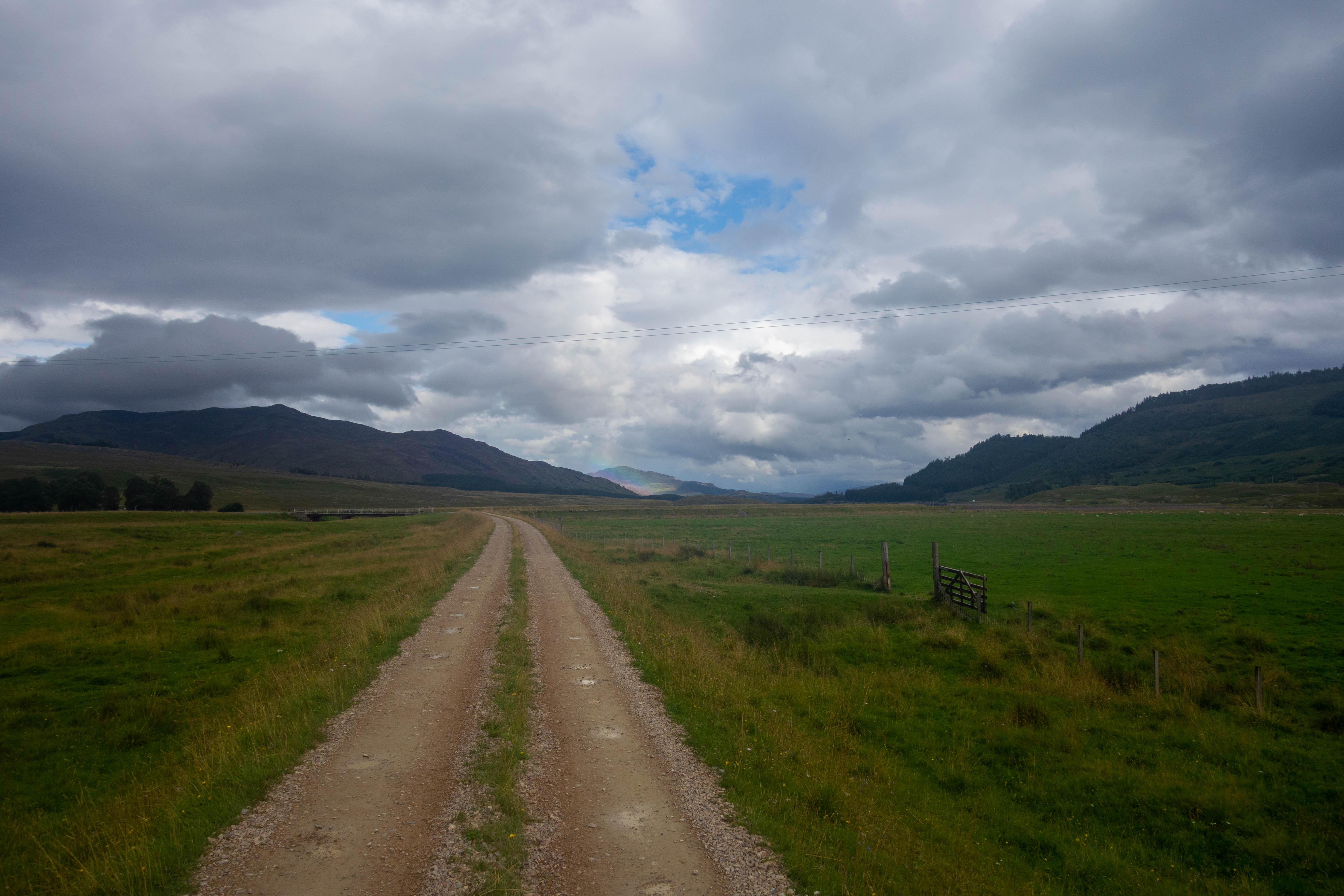 I left the road and headed up the track that took me uphill through the valley, past a few abandoned buildings and a stream where I managed to refill my bottles at the top of Loch Vaich. I headed down into the Alladale Wilderness Reserve, past their remote lodge nestled between the steep sided hills, where I joined a well-made estate road. I paused for a moment on the bridge that crossed the small river to admire the scenery – a small green valley leading off into the distance between the steep sided hills. I followed the track down the valley, past some estate buildings and the church at Croick where the road came to an end at a deer gate and a blue sign read “through road to Ullapool, no vehicle access”.