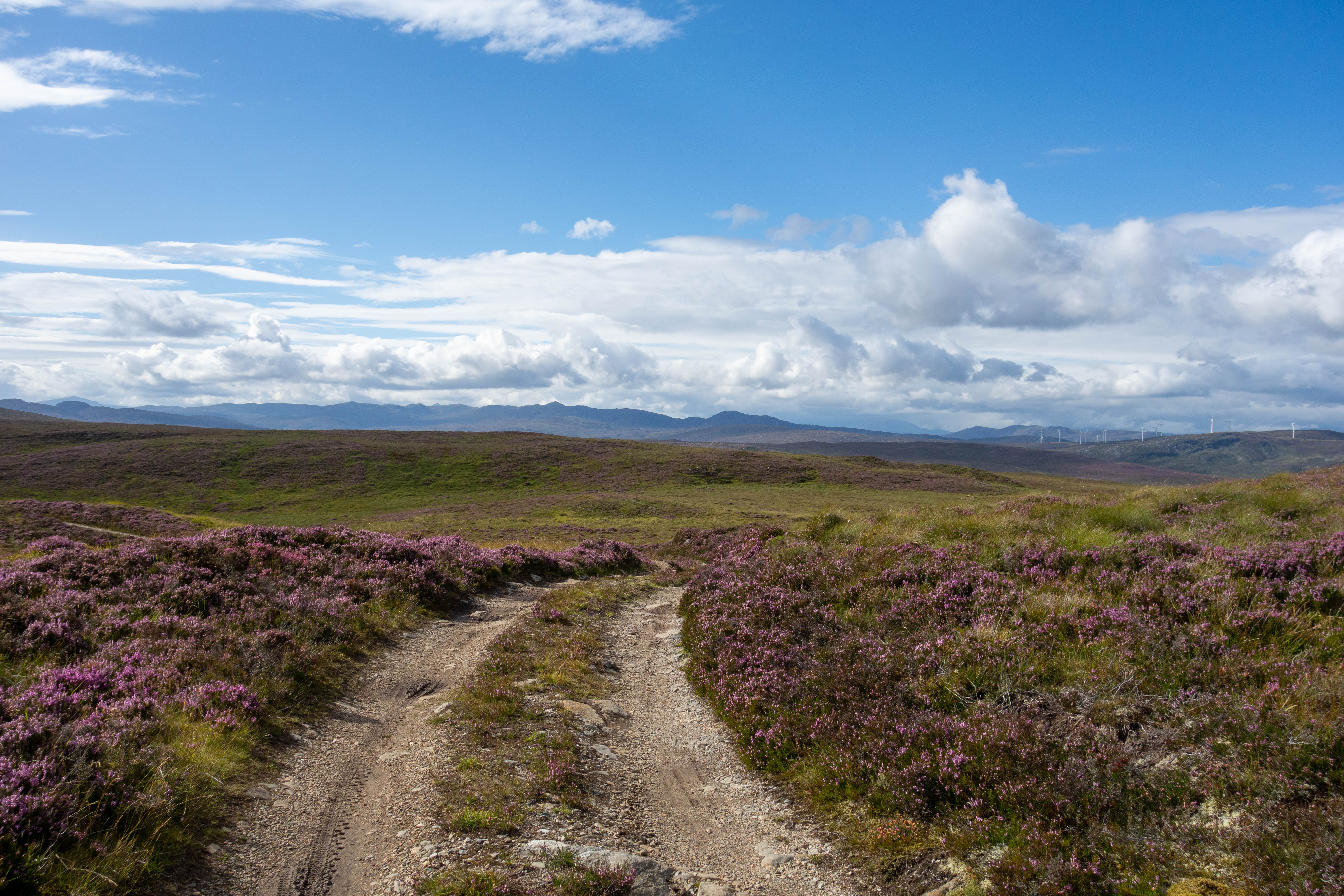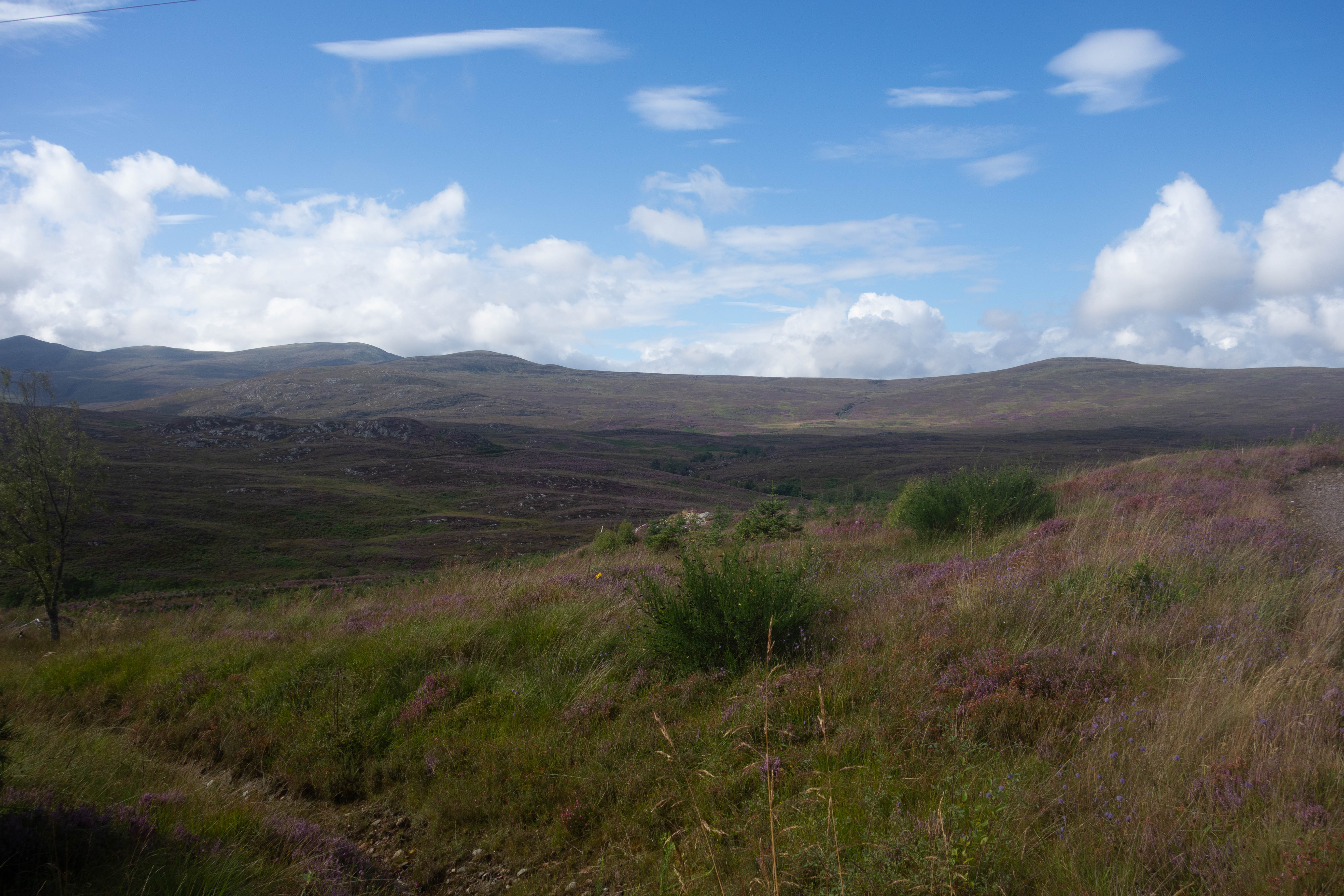 The ride continued down pleasant roads through the glen before turning off and climbing up onto the moor. As I climbed, the sun came out, reflecting off the wind turbines in the distance and bringing out the purple of the heather. The trail descended gradually round the valley, following a half buried pipeline before heading across the top of Orrin Dam. I caught up with some bikepackers from Germany who were riding off road from Lands End to John o’ Groats. I stopped by the dam to take some photos and the Germans headed off. I chased after them down the tarmac access road but they were gone.