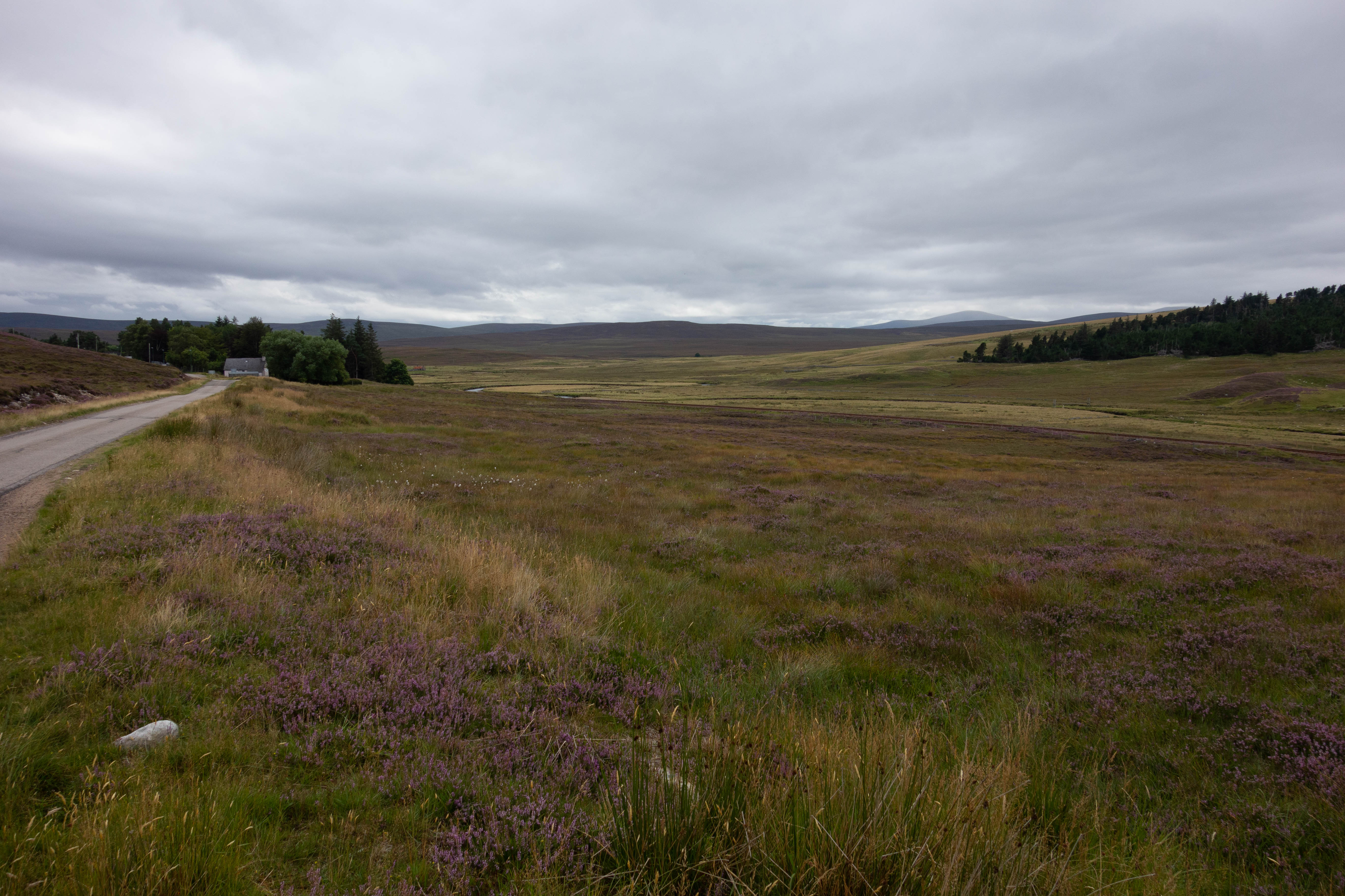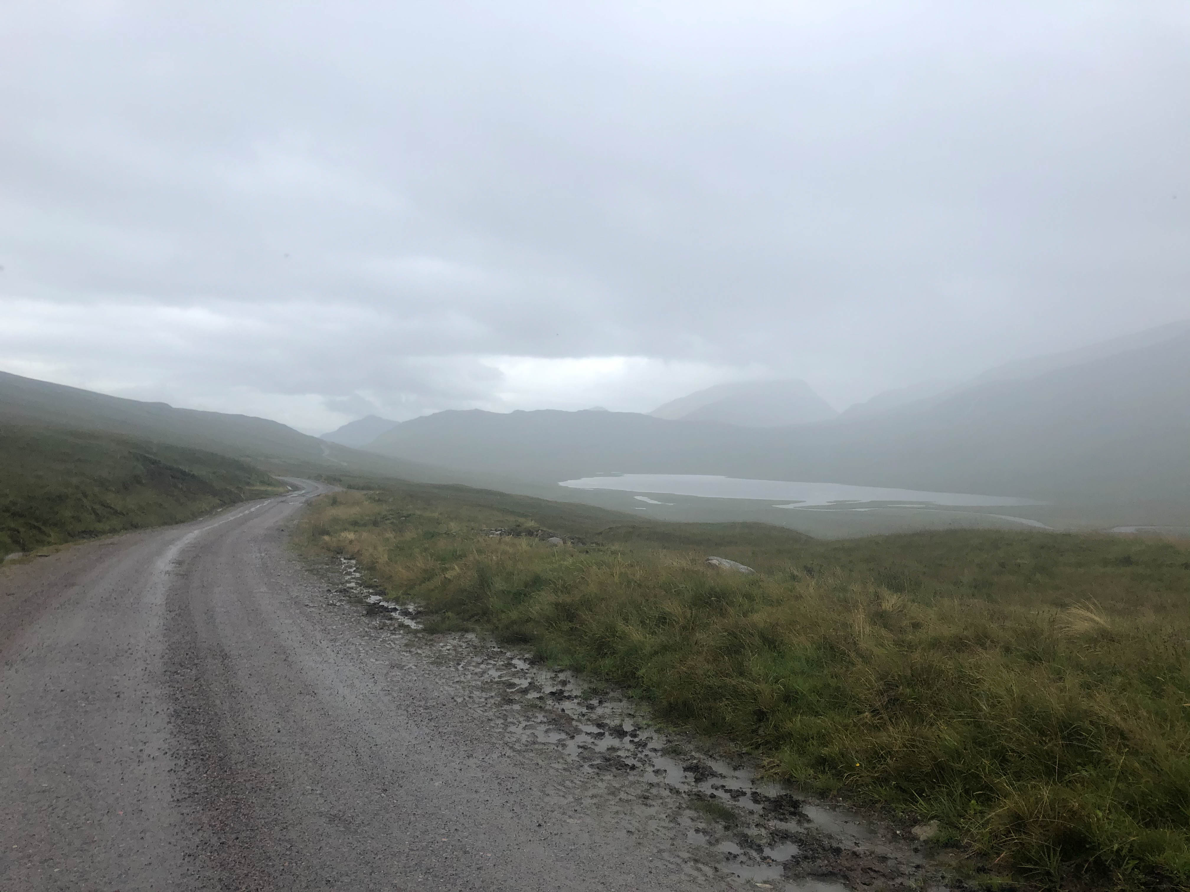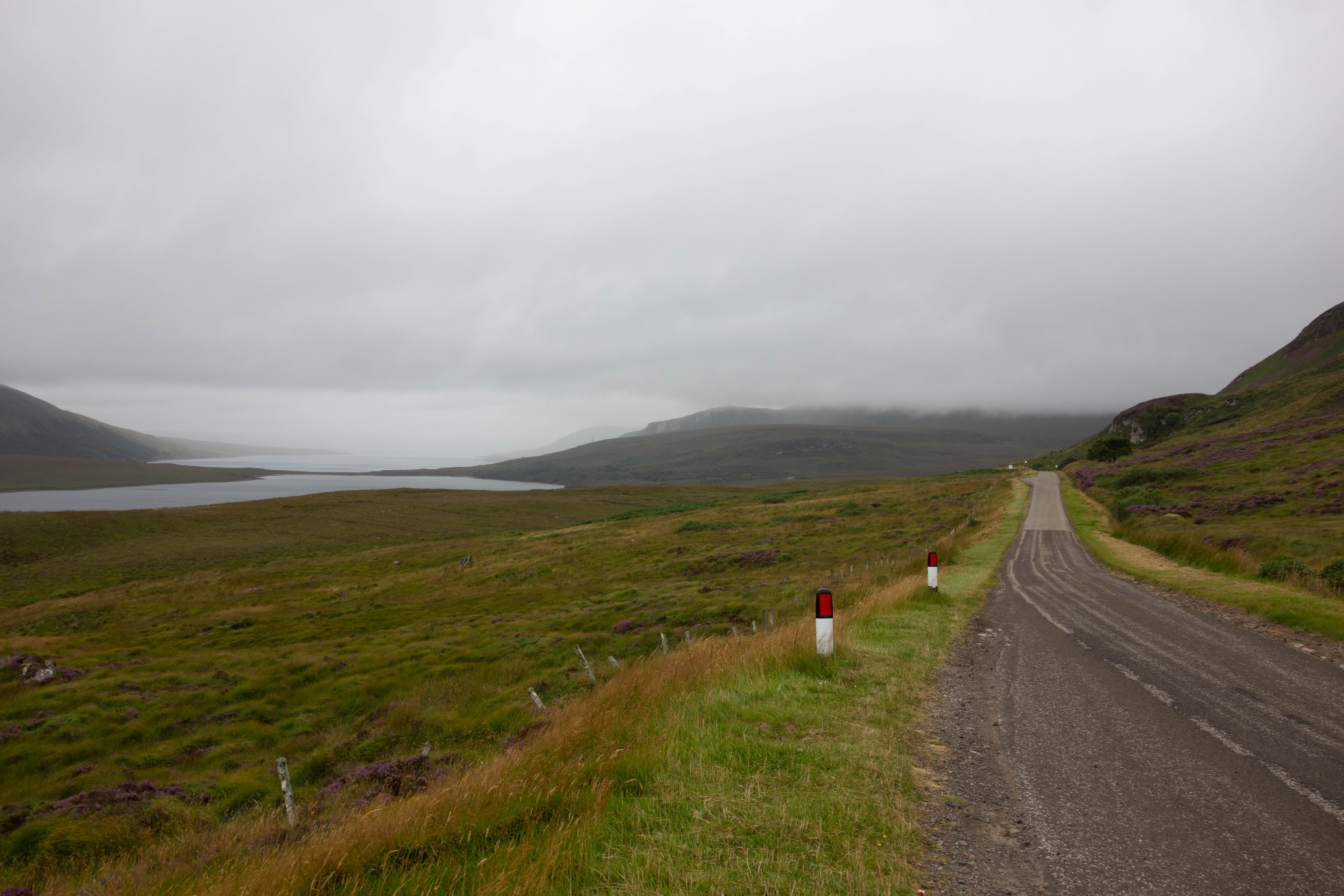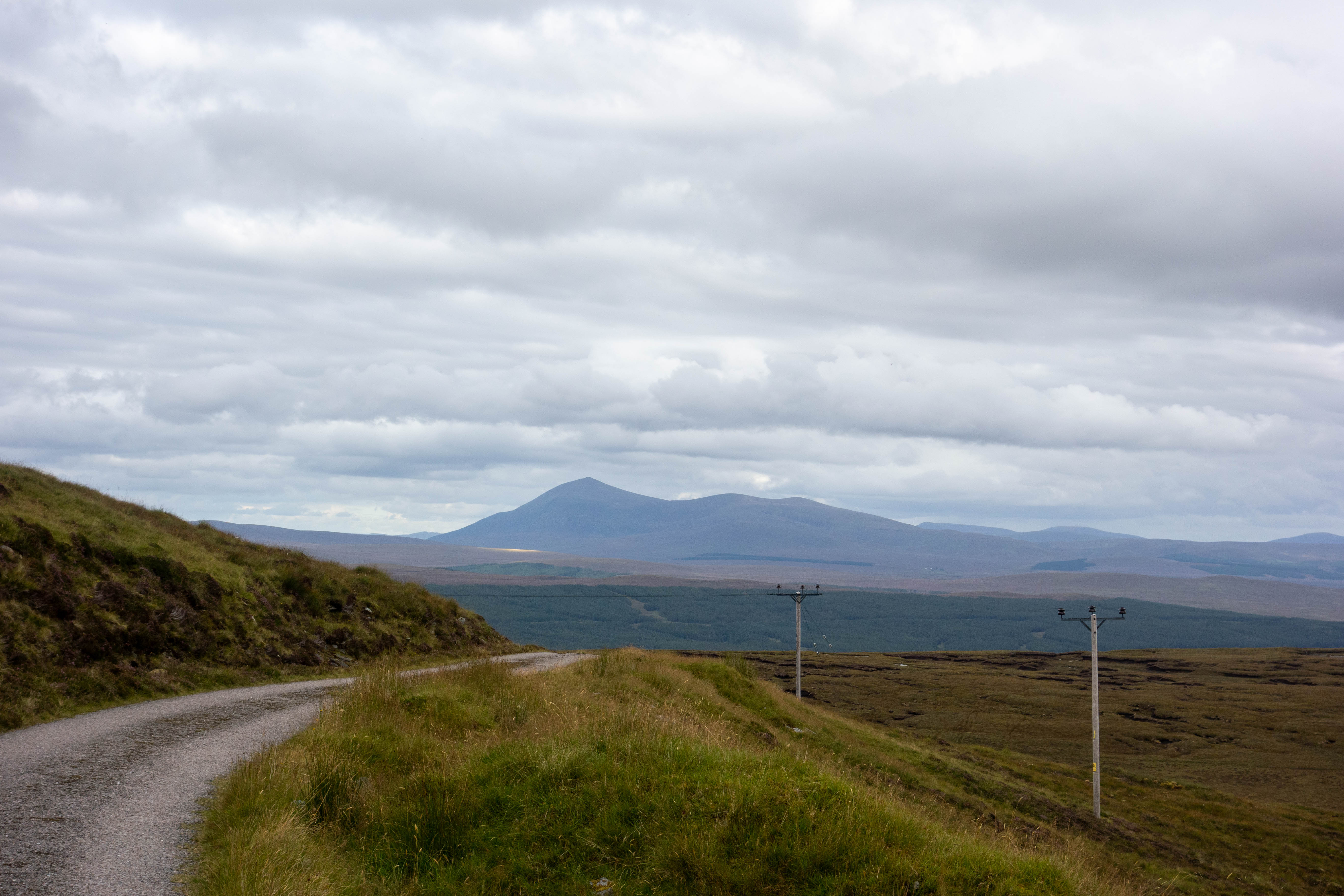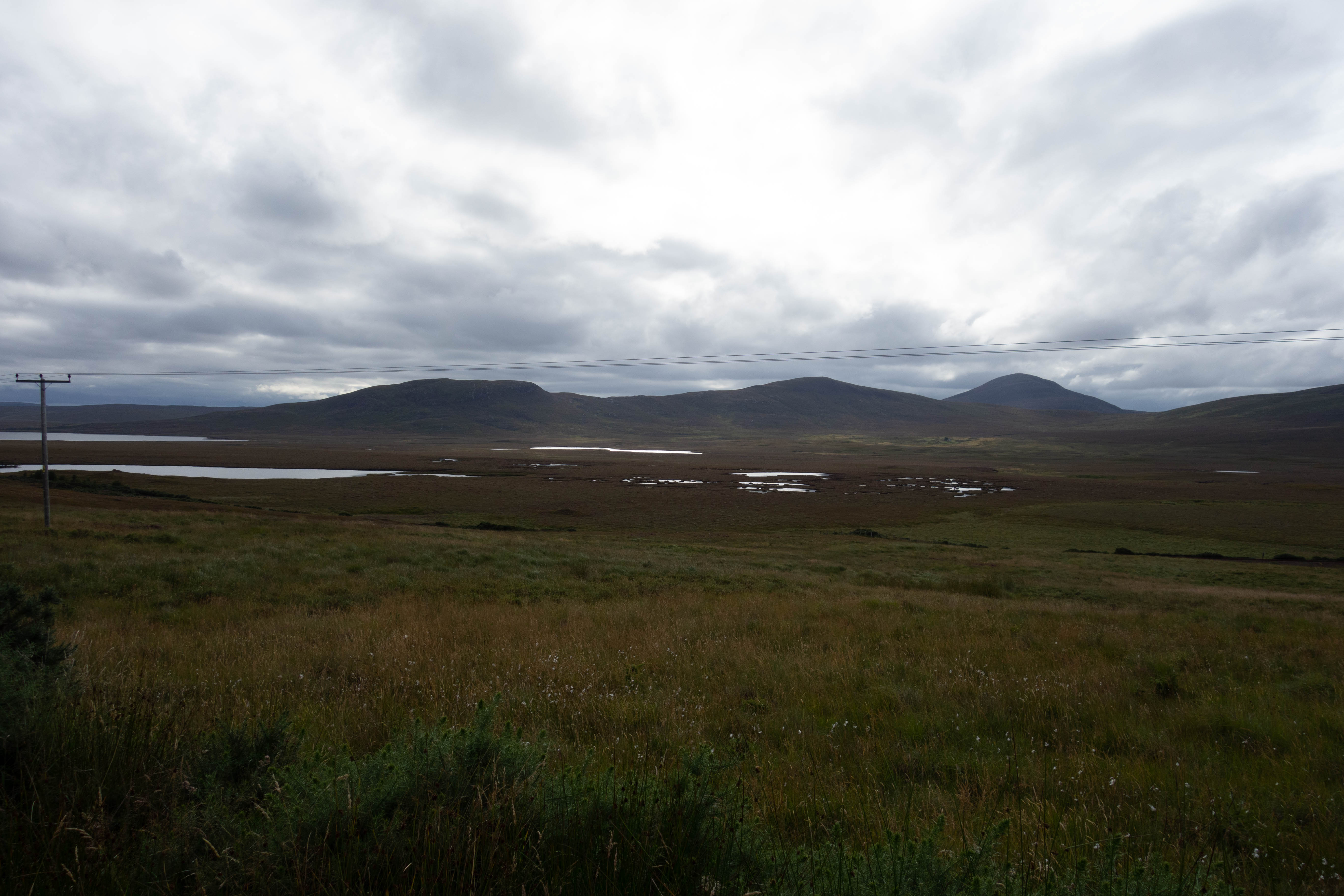 The day started off dryer than the previous day, but just as grey. I left the bothy and walked/rode back to the road where I headed south along the shore of Loch Loyal. The road was easy riding, with a few small hills but nothing challenging. The landscape was, in most parts, uninspiring compared to the previous few days. There was no wind today and the midges were everywhere. I had to put my midge net on at one point as I couldn’t cycle up hill fast enough to keep them off.