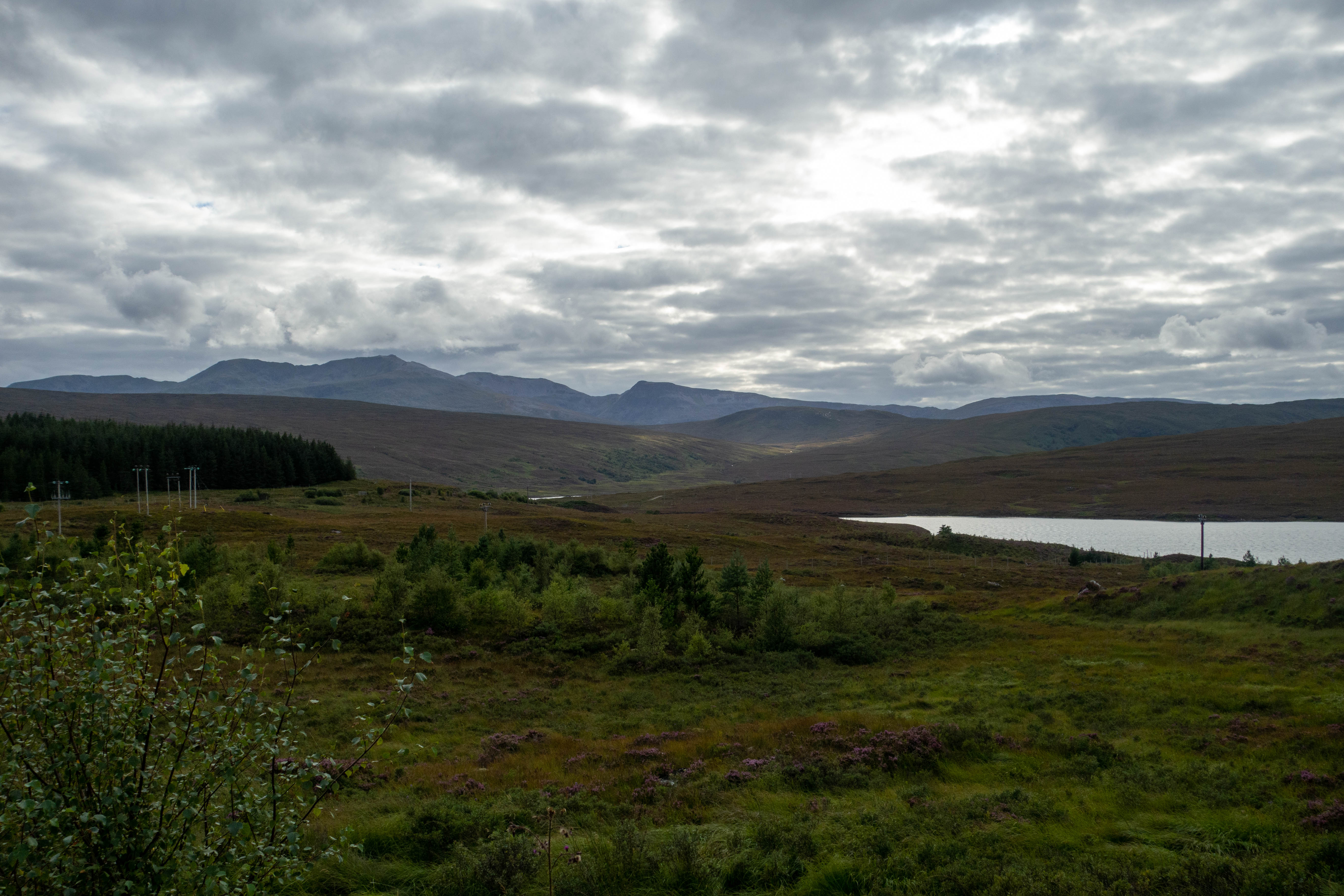 The road weaved its way along the side of the glen, looking down on a small house and cattle grazing. I passed through a gate, descended through forest to Loch Laggan and turned to follow the trail along the edge of the loch. The trail was quiet, the rain had stopped and the shore of the loch would have made a lovely place to stop for lunch if it weren’t for all of the midges. I kept riding, past the fairytale castle lodge of the Ardverikie Estate, down the drive and out onto the road. I crossed the road and climbed up a short steep track to join one of the old military roads. I could see down over the beach at the end of the loch. There was a bit of breeze up here that kept the bugs away so I stopped to heat up a strange veggie chili pot that I had picked up from the Co-op the previous day.