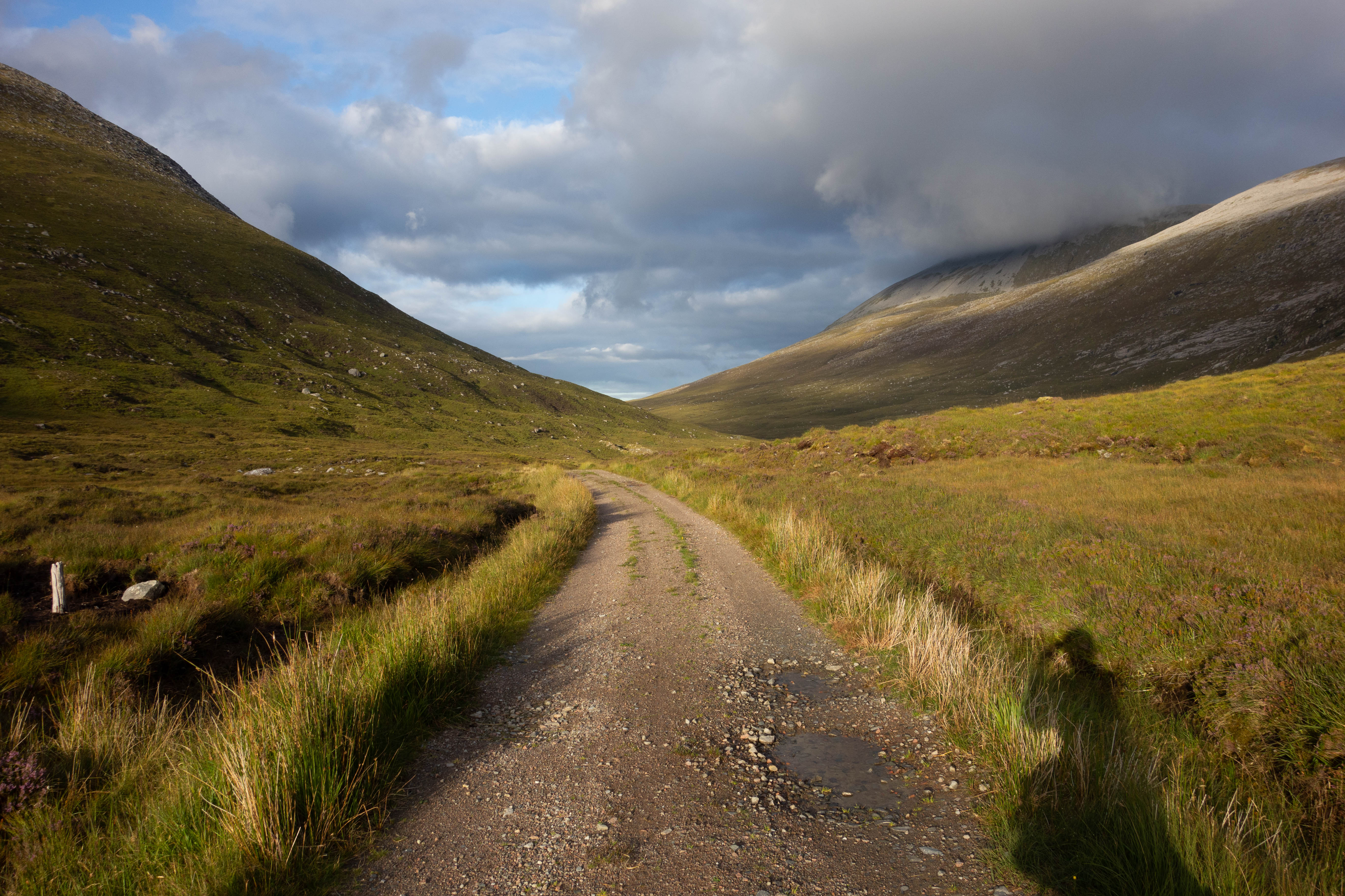 I continued along the road to Glenrossal. The road followed the river past several empty hunting and fishing lodges and wound its way gently up the glen. This glen was beautiful, with the river meandering its way up the wide base of the valley, a few remote lodges and hills gently sloping up to the moorland either side. The road turned into a track and climbed up to the small reservoir and hydro station before turning back to tarmac.
