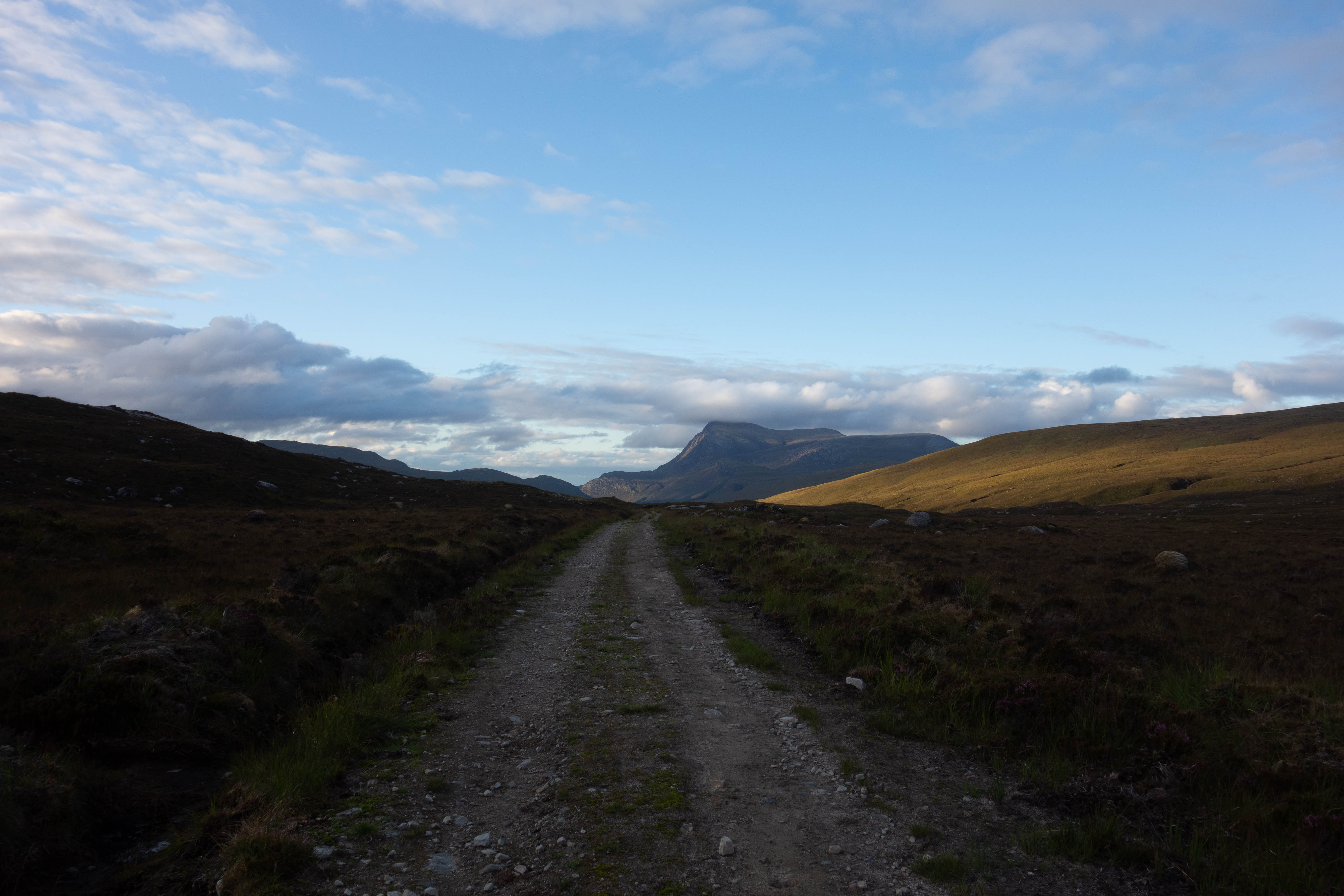 I turned off the road several miles later and headed up a pass. The sun was setting and the light on the hill was amazing, although the midges were out in force now and every time I stopped to take a picture I was attacked. I followed the track down the other side of the pass and through the grounds of an empty, but beautiful maintained lodge with sculptures in the grounds and neatly mown grass before following their drive up to the road. The sun was still setting and the ride down the glen through Alltnacaillich with the last rays of light illuminating Ben Hope was amazing.