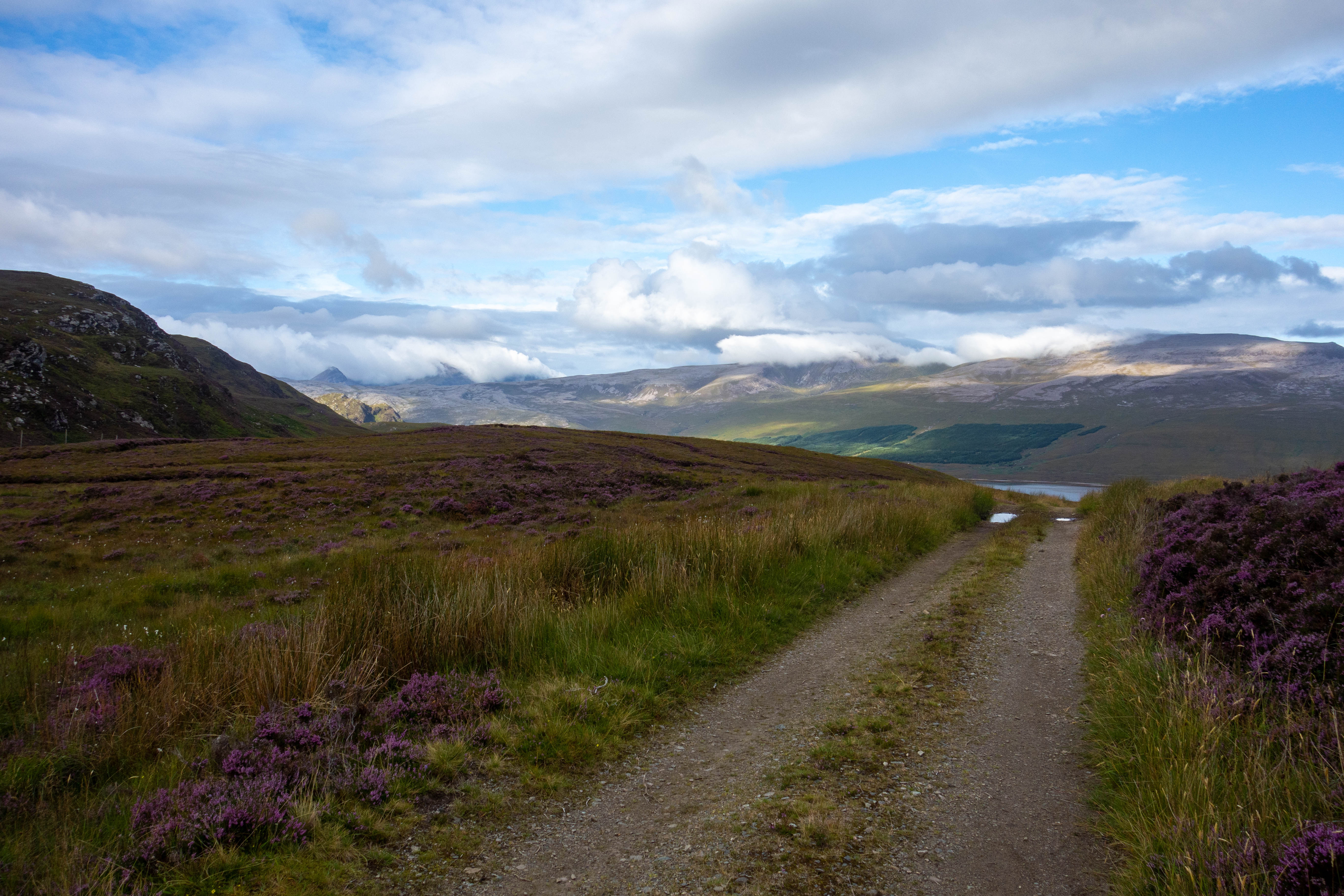 At the end of the loch was Loch Choire Lodge, a collection of farm buildings and lodges with some fishing boats moored up on the shoreline, from here the trail improved greatly with a nice gravel estate road. I made an error when plotting the GPS route and ended up taking a 40 minute detour through thigh deep heather and having to climb over a deer gate only to rejoin the main track again. But once back on the gravel I made good progress, past several lochs and people fly fishing until I joined the tarmac again.