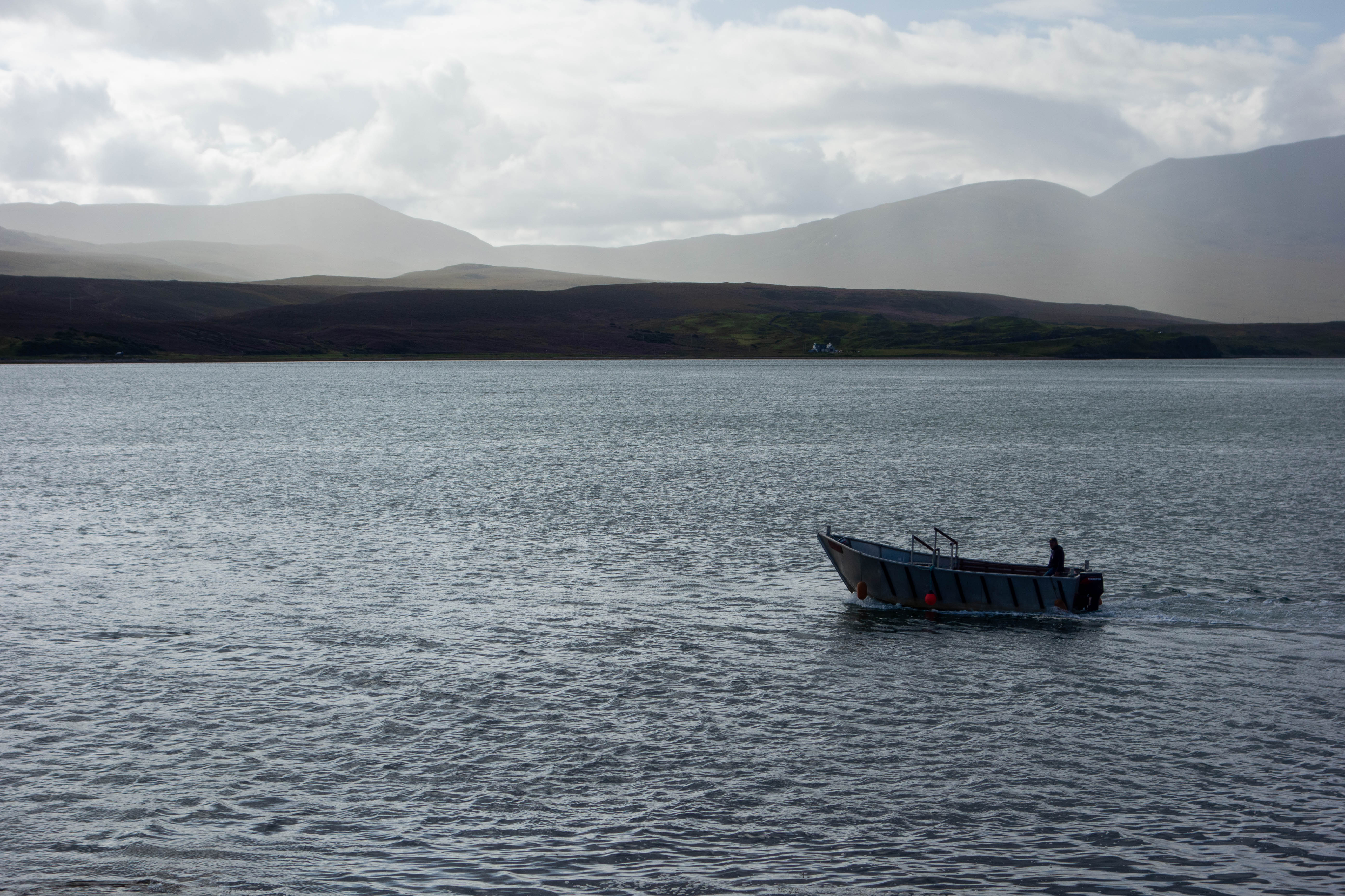 The ferry to the Cape Wrath peninsular leaves from the end of a small road that heads north from the main road along the side of the sea loch. At the end of the road there was a slipway, a bus shelter with a cement mixer in it and a small sign with a phone number on, but no ferry. After a short phone call I could see a small boat heading across the loch towards me. The ferry was a small aluminum boat, with no cabin and space for about 8 people.