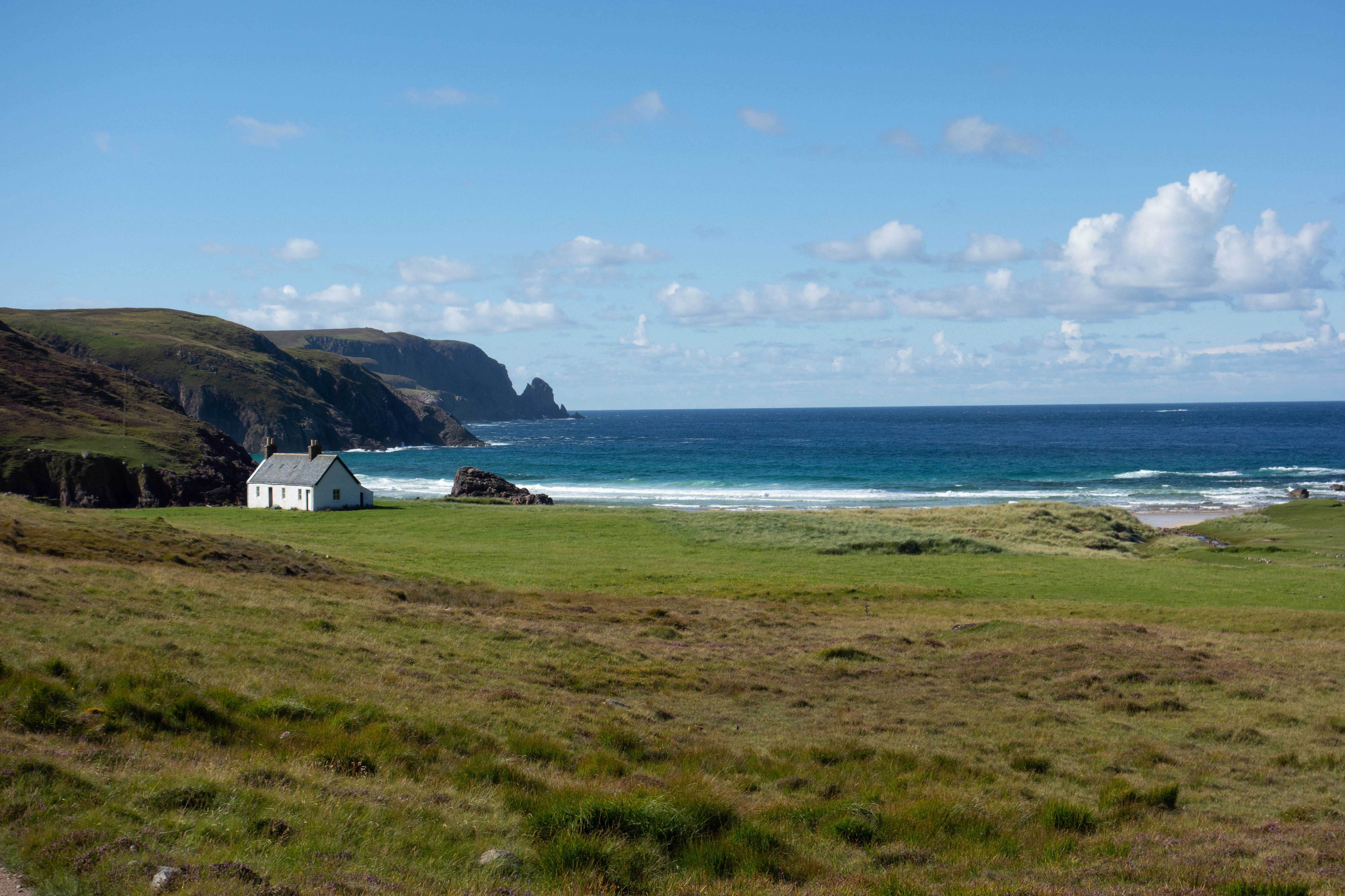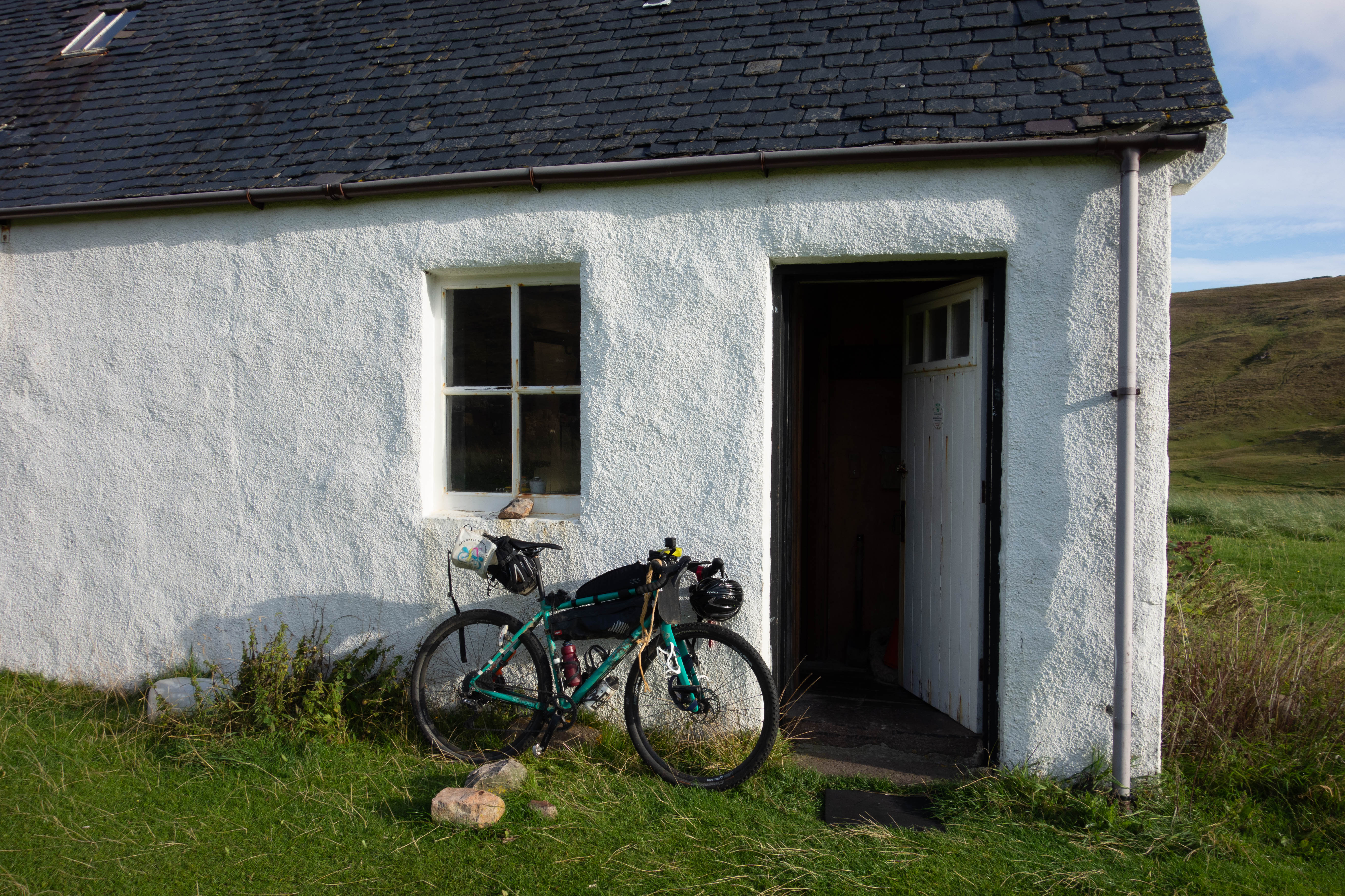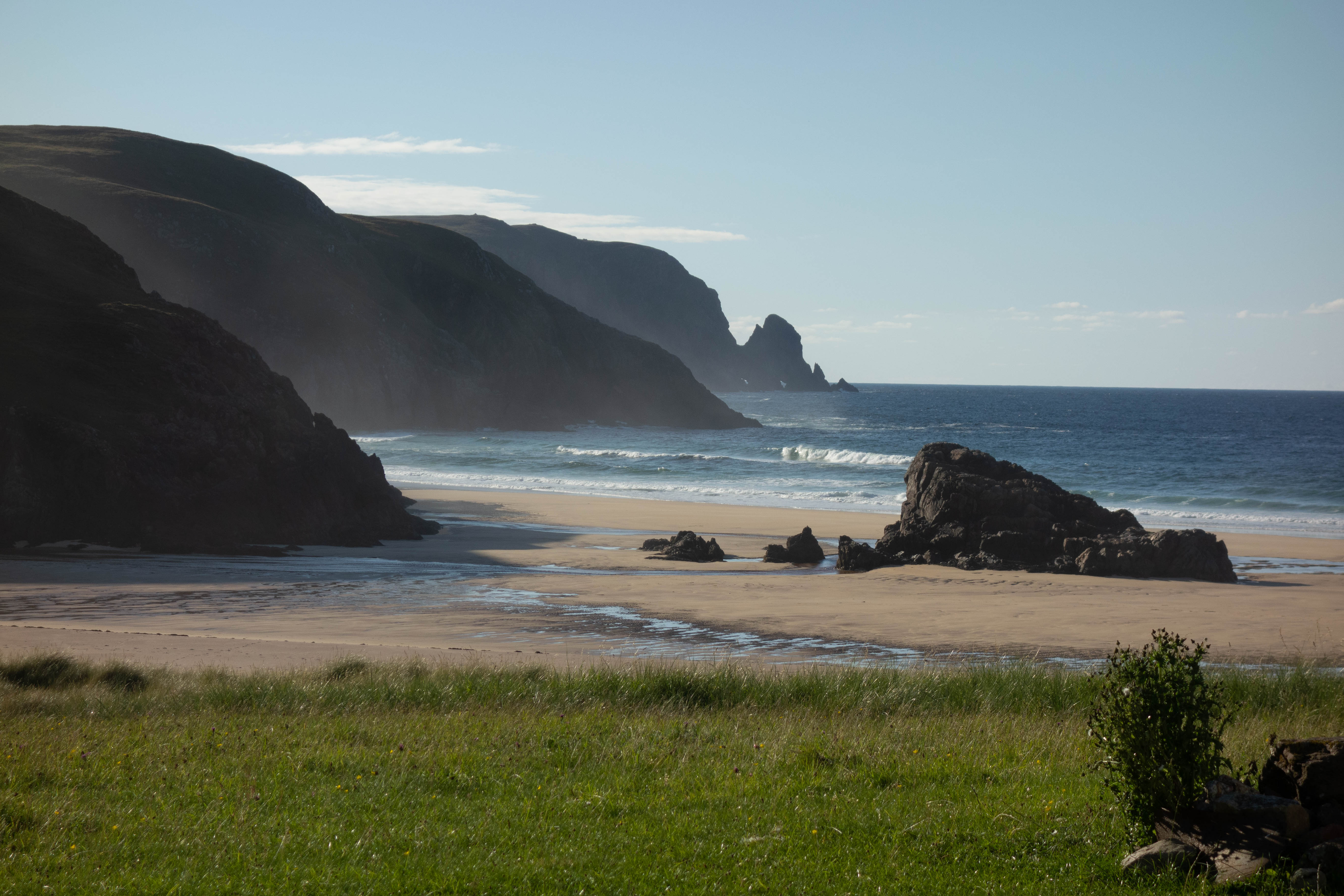 After wandering around the lighthouse for a bit, I had a cup of coffee, some beans on toast and a piece of cake in the café before heading back down the road towards Kearvaig, where I planned to spend the night. Kearvaig is a pretty special place and a lovely whitewashed bothy sits on a grassy area above the beach, looking out over the sand towards the endless ocean framed on either side by tall dark cliffs. It felt like there was more to it than just the location, perhaps this was down to a combination of the way I had gotten there and the sunshine. A small Eden tucked away from most people. A fitting (almost) end to a journey. I dried my tent out, walked barefoot across the beach, climbed a small pile of rocks and spent the rest of the afternoon sitting in the sunshine watching the waves crash into the sand and reflecting on my journey.