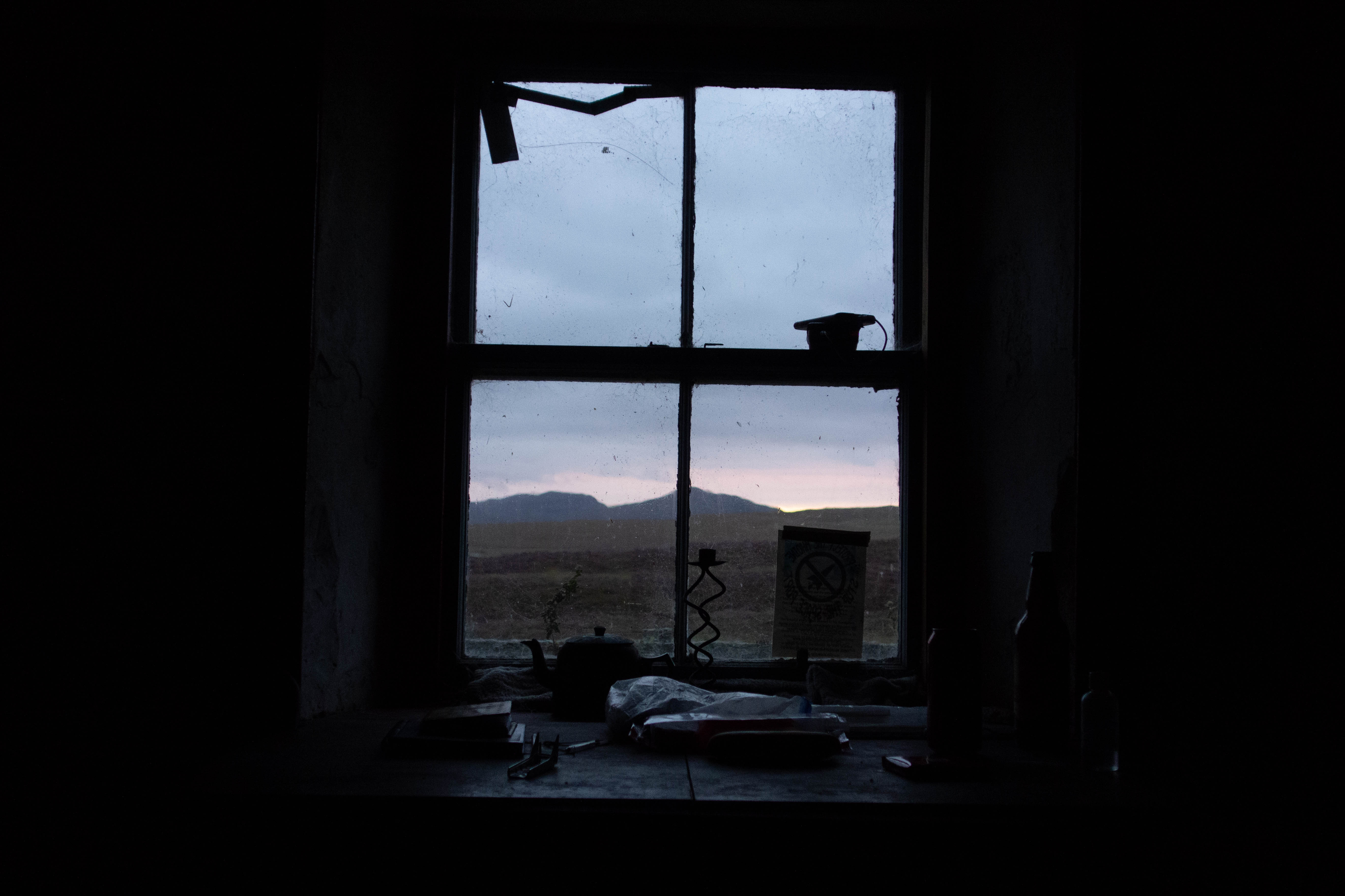 It was nice to get off the main road but the rain was increasing and it was miserable. I took a detour off the road, heading east around Loch Loyal in search of the bothy that was hidden around the other side, hoping to get out of the rain. The track to the bothy was not really a track but loose pebbles on the shoreline of the loch followed by some bushes, a ditch with a slippery plank over it and some boggy grass. As a result it was more of a walk than a ride. I was soaked by this point and just hoping that the Bothy would be unlocked. It was. I managed to dry out and warm up a bit. The rain had stopped by this point and the sun was setting behind the hills on the other side of Loch Craggie. I decided to stay here for the evening.