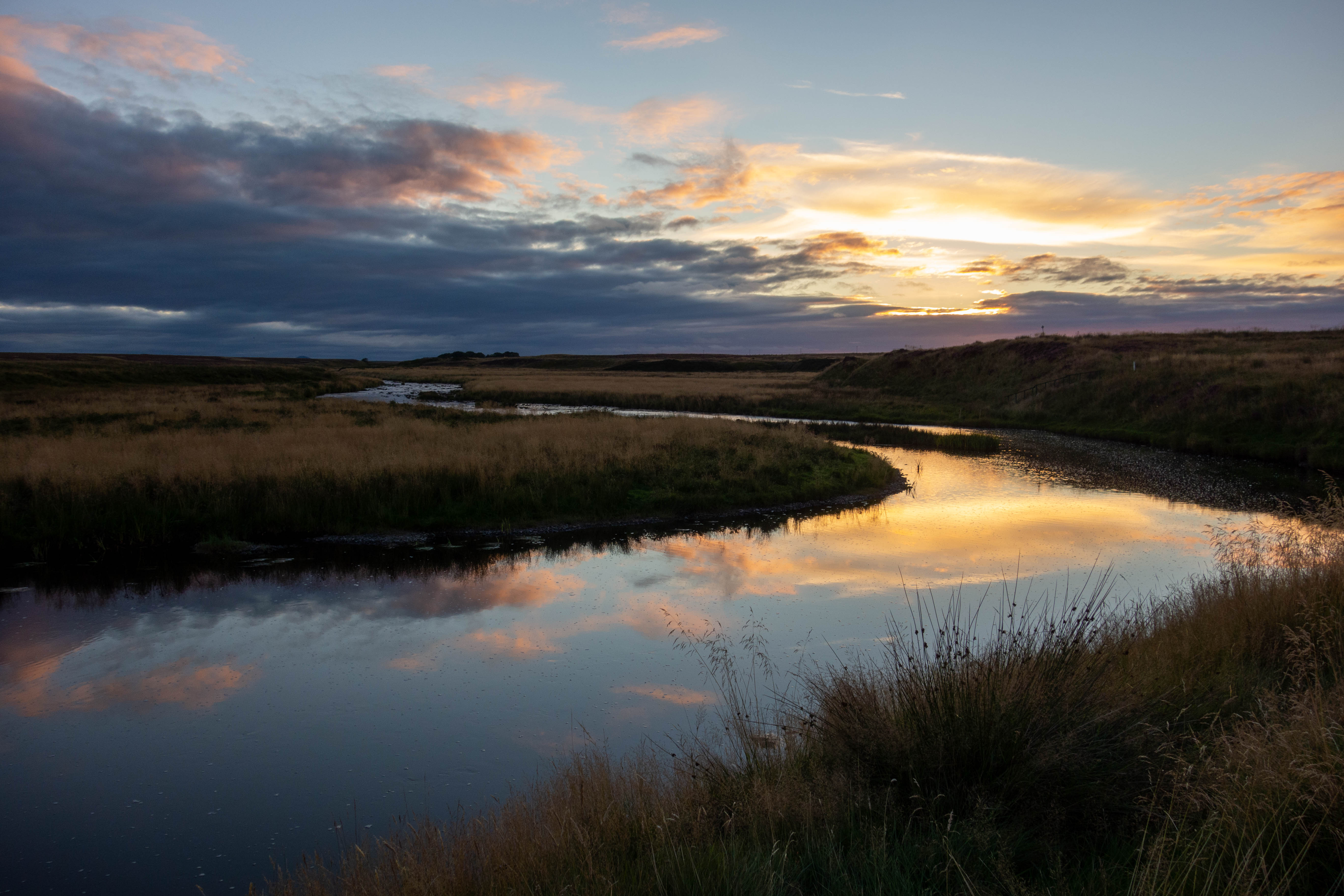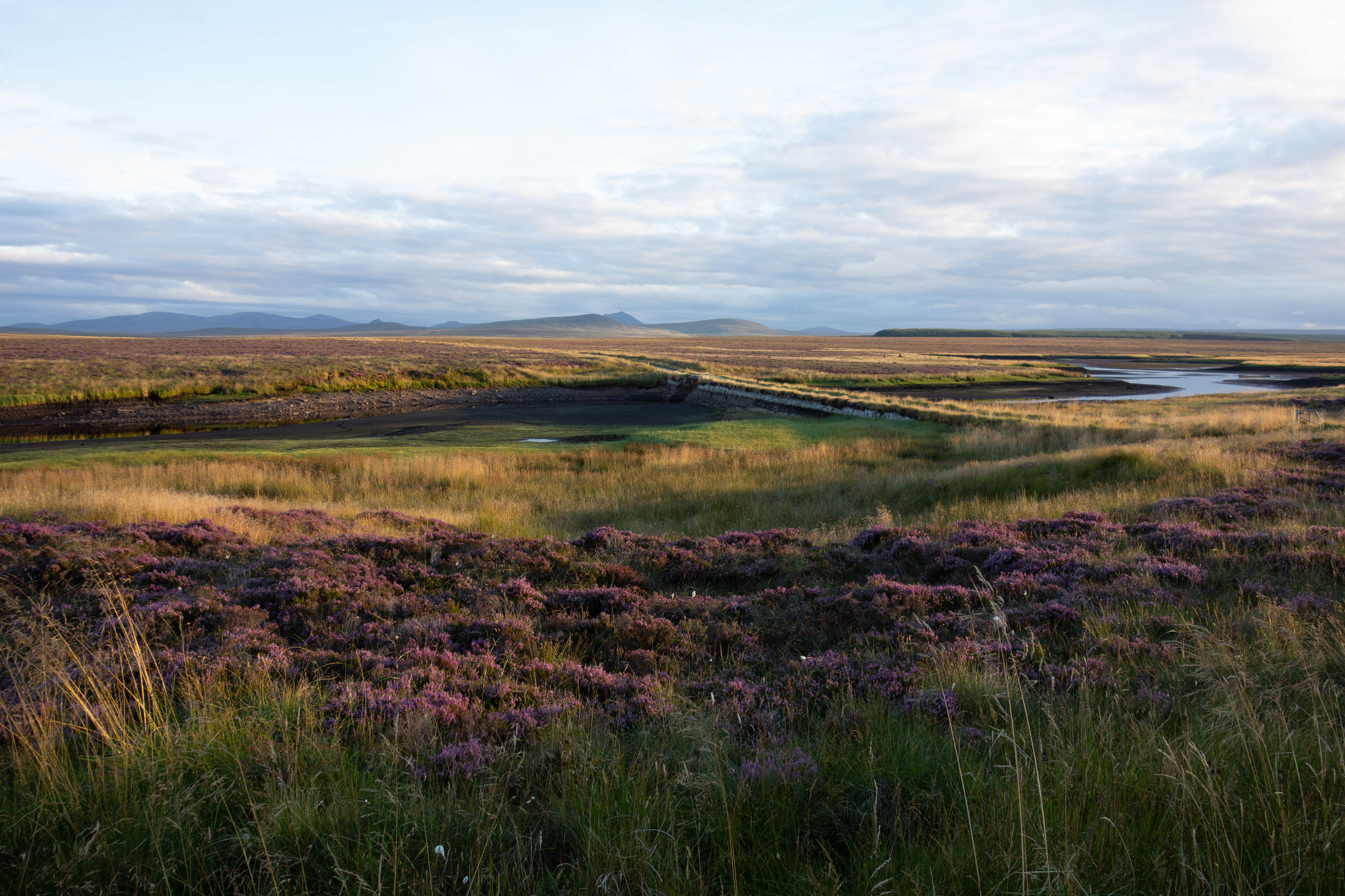 The sun was setting and the evening light was fantastic as I crossed the railway line at Altnabreac. I left the forest and joined the tarmac again and could see wind turbines in the distance. The sun was setting and I needed a spot to camp. I found somewhere just off the road beside the River Thurso. I pitched my tent, cooked my last dehydrated meal and sat watching a man fly fishing upstream as the last of the light disappeared.
