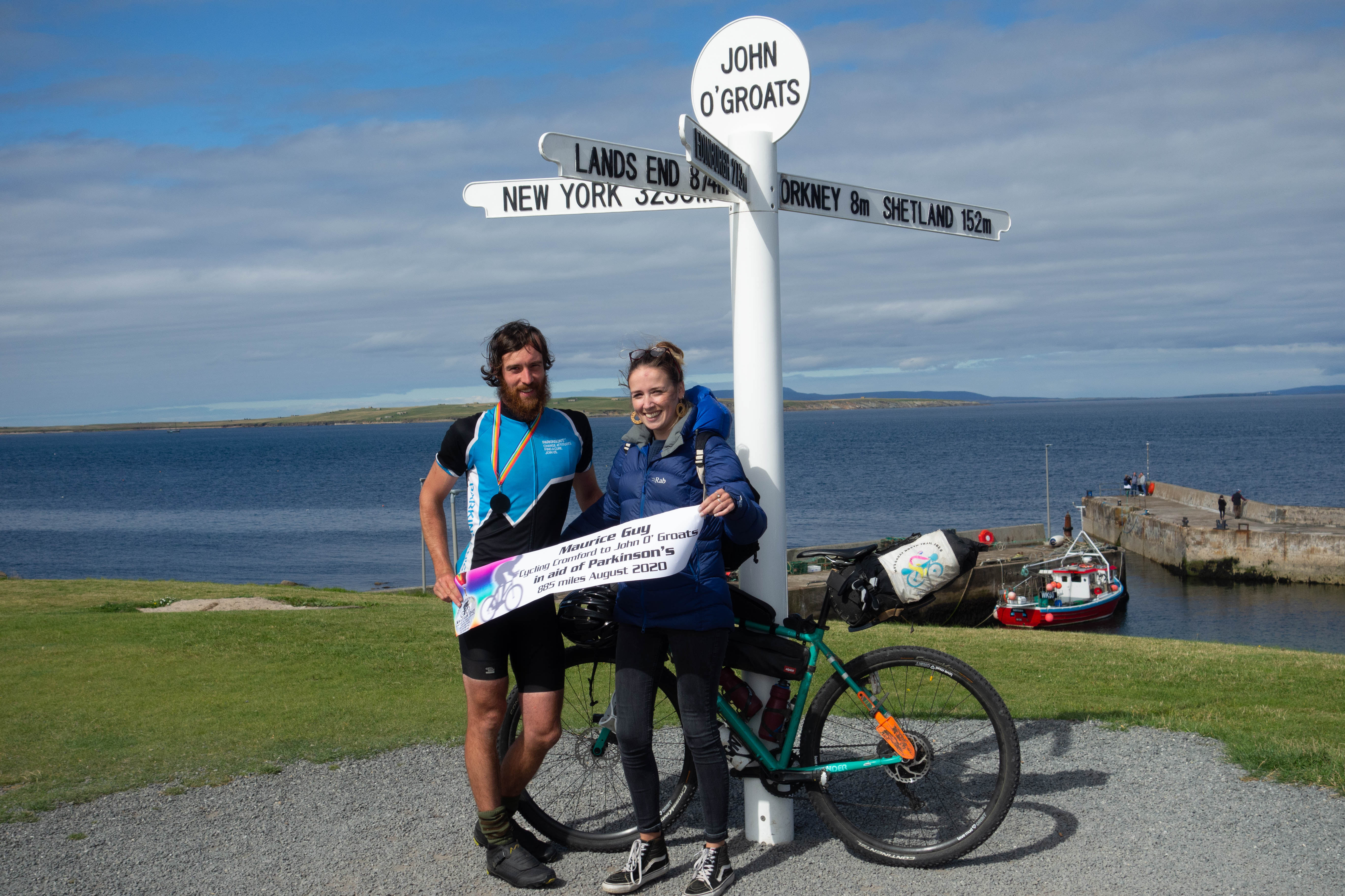 I rolled down the hill towards the harbor and the famous sign post. Selina and her mum, Fiona, were waiting for me by the sign. They had made a banner and a medal. As we joined the queue to get a photograph, I couldn’t help but think that most of the people here hadn’t earned their photograph in the same way I had. They’d missed out on the adventure that I’d had, but perhaps they’d had their own adventures. As we stood by the signpost, Fiona somehow managed to get the rest of the people waiting for their photographs to clap. I cringed slightly but tried to smile.