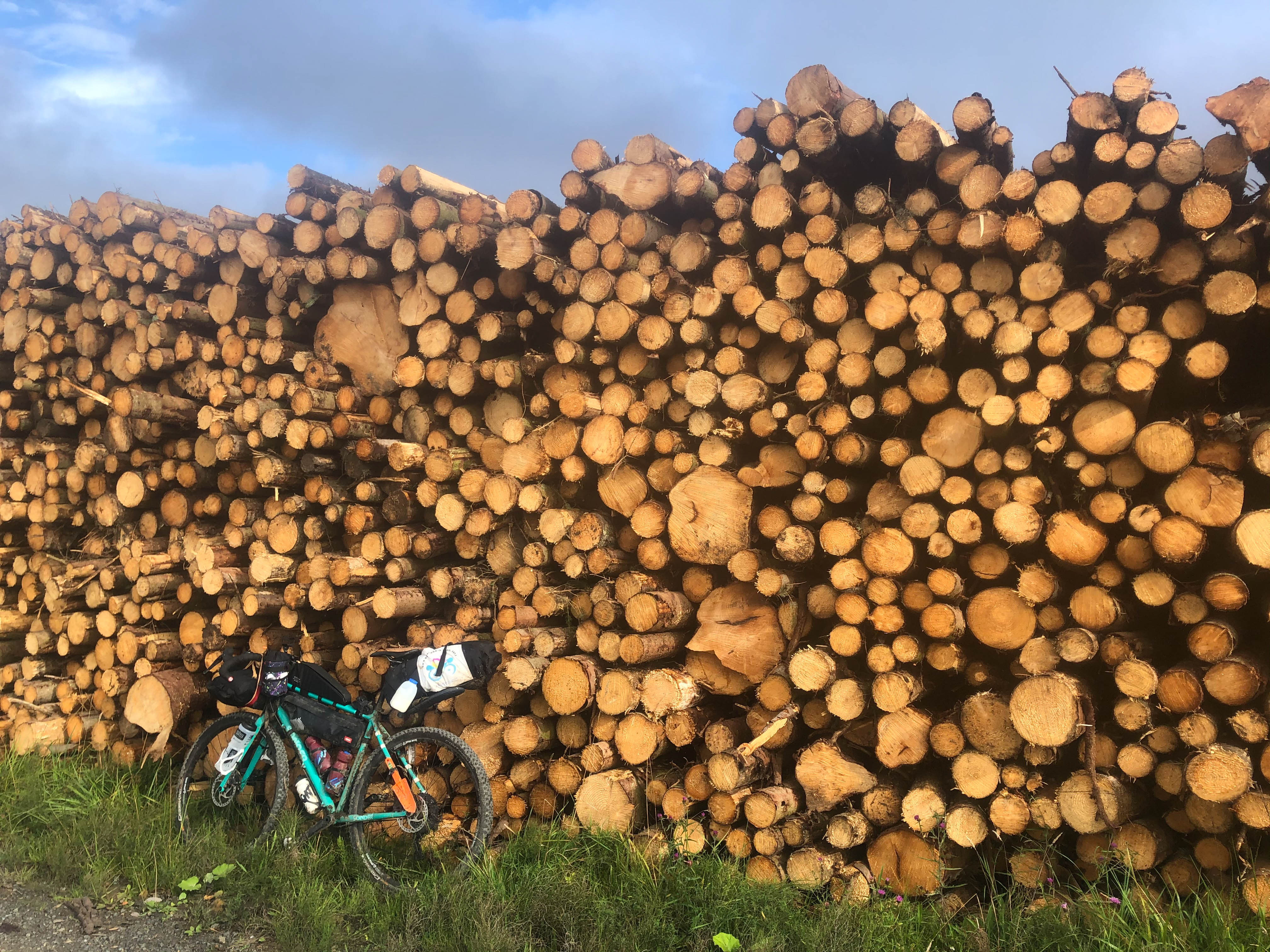 It was a misty start to the day and I watched a shepherd on his quad bike feeding the sheep whilst I cooked breakfast. A pleasant but cold ride through the undulating landscape of the borderlands led me into Kielder Forest and some fabulous riding on well-made forest roads. I rode past Green Bothy, where I had planned to stay last night, past swathes of felled trees, log stacks and pine trees and down to Kielder Water and 2nd breakfast at The Waffle Cafe. Whilst I was eating my waffle breakfast (it was a bit weird but tasted pretty good) two bikepackers passed and I set off as soon as I had finished, along the purpose made cycle trail round Kielder Water, trying to catch them.